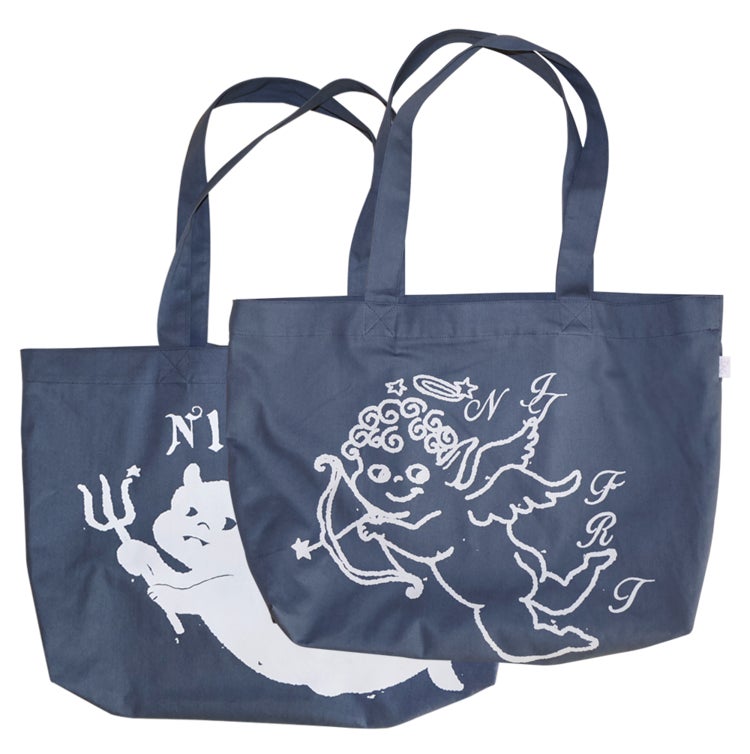 ナイトフルーティのちび天使と悪魔が両面にプリントされたトートバッグ