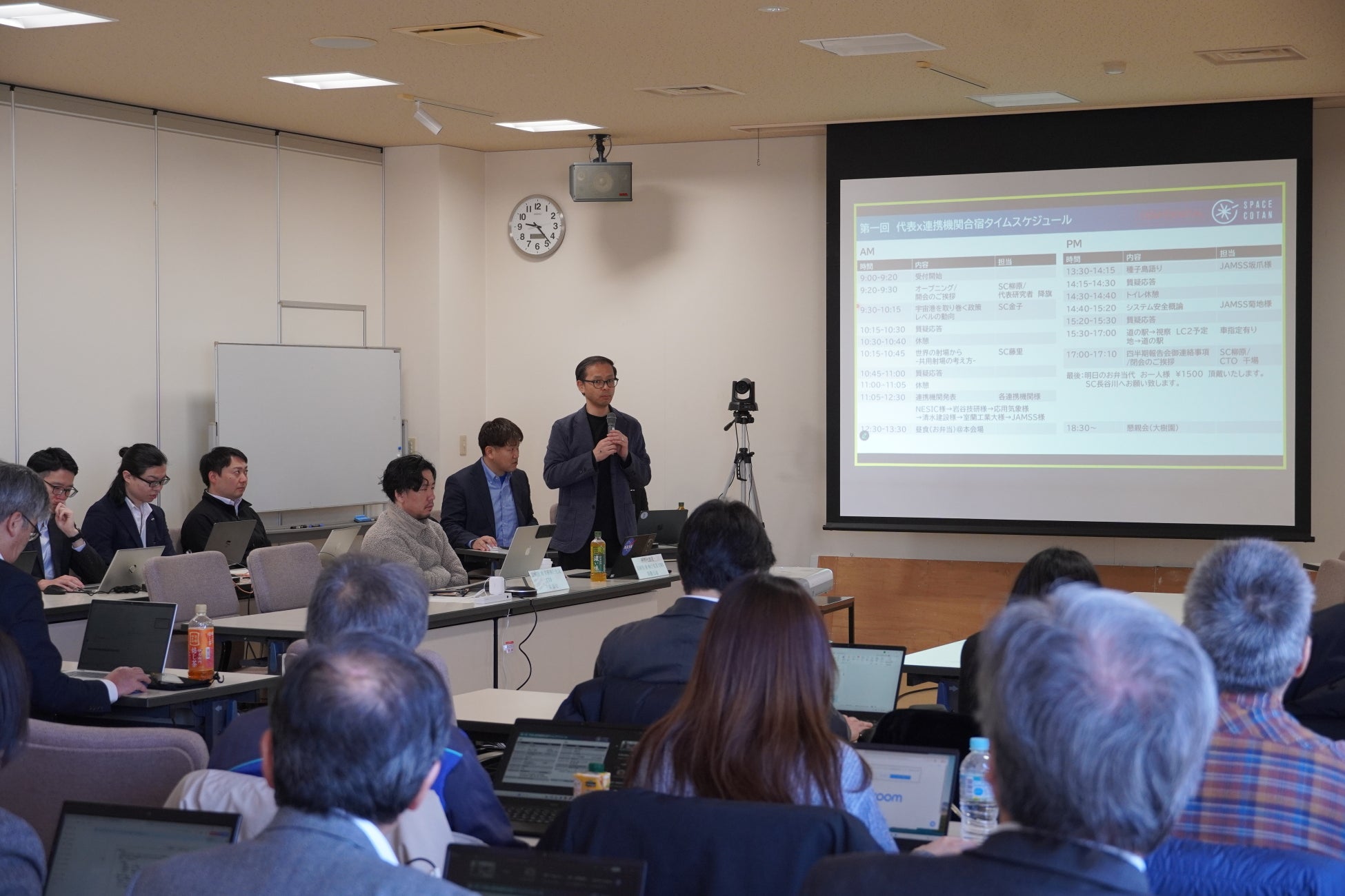 今回は、約1年後にステージゲート(SG)を計画していることを踏まえ、各連携機関の研究状況について重点的に議論することを目的とし、まずは代表機関であるSPACE COTANからHOSPO全体システムの検討状況(運用フローの検討、全体システムのモデル化)、続いて各連携機関から詳細な検討状況(サブシステムの設計仕様、検証計画等)を報告しました。