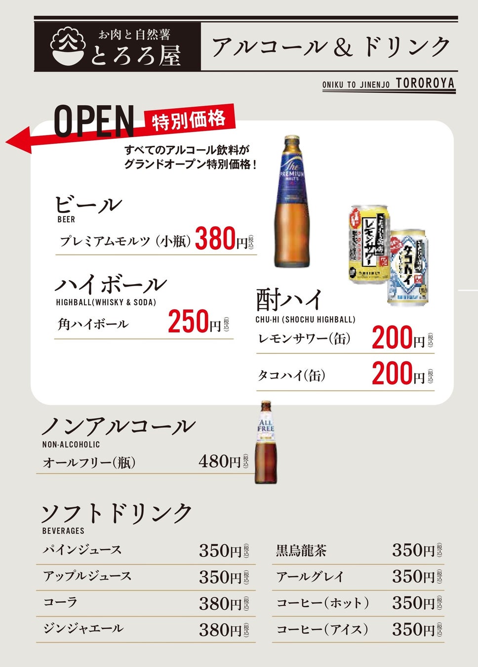 さらに、アルコール各種もオープン特別価格にてご用意しております。