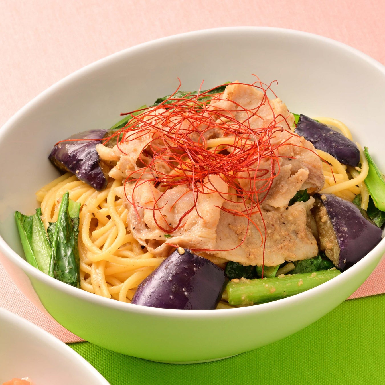 「ごま香る豚しゃぶの和風仕立て」は、大好評につき今年も再販する一品です。やわらかな豚しゃぶに、華やかな香りのごまだれを合わせ、春らしい軽やかな味わいに仕上げました。小松菜のほろ苦さと揚げなすのコクに、醤油や胡椒、海苔、糸唐辛子の風味を重ね、全体をバランスよくまとめています。