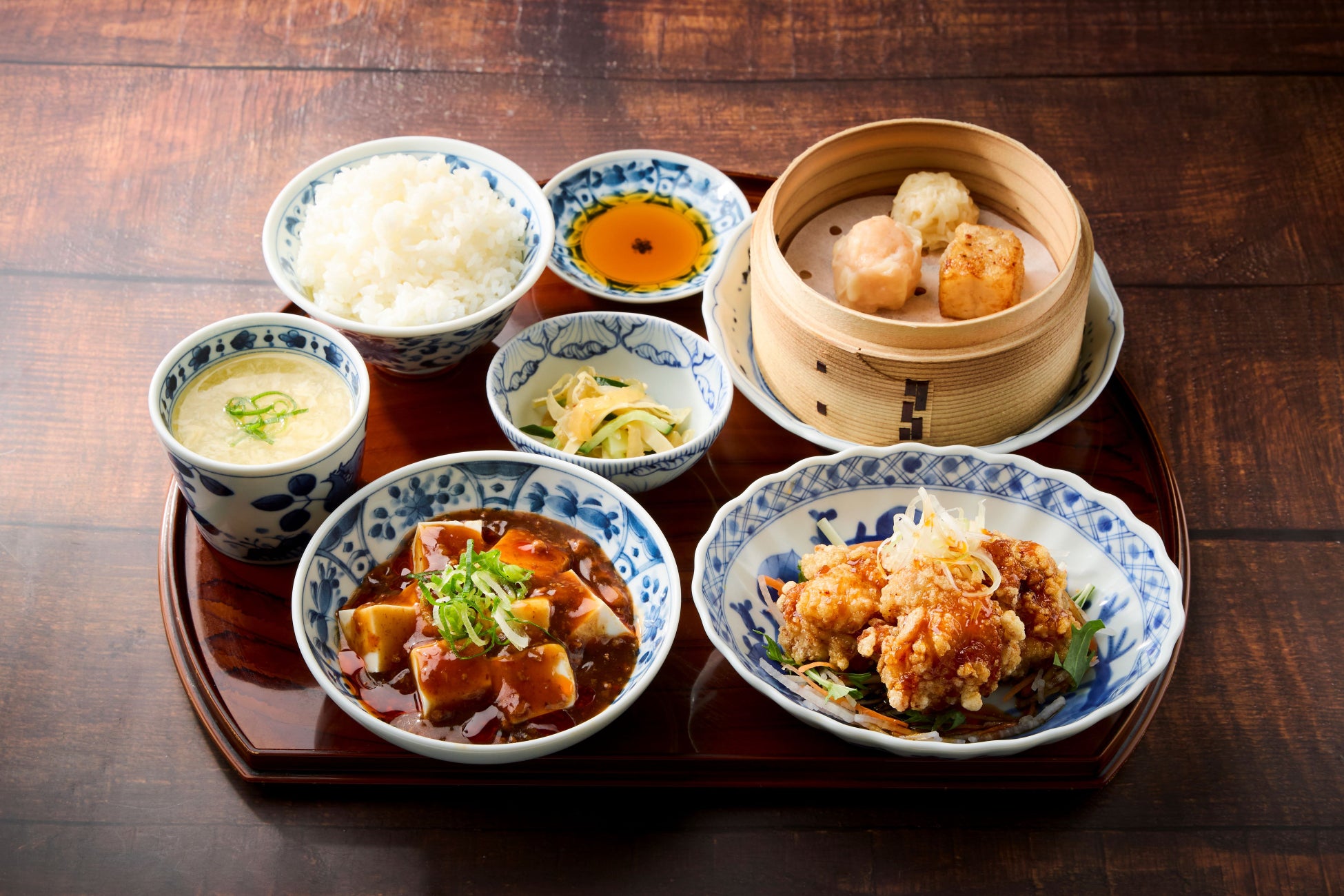 湯葉と豆腐の店 梅の花ならではの自社製豆腐を使用した麻婆豆腐と油淋鶏、点心3種がついたご満足いただける定食です。油淋鶏や海老のチリソースをメインにサラダ・白ご飯・スープがついた平日限定のランチ定食。プラス料金で点心3種もおつけできるので満足度もアップ!ご飯の大盛も無料なので、しっかり食べたい方にもおすすめです。