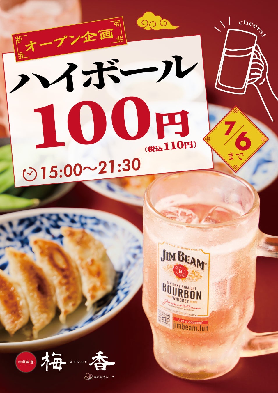ハイボールを特別価格110円(税込)でご提供いたします。このお得な機会に、梅香自慢の中華料理と共にお楽しみください。