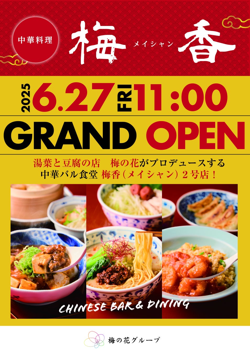 株式会社梅の花サービス(本社:福岡県久留米市、代表取締役:野田安秀)が運営する「中華料理 梅香(メイシャン)」の2号店が、2025年6月27日(金)に大阪・阪急三番街地蔵横丁にグランドオープンいたします。