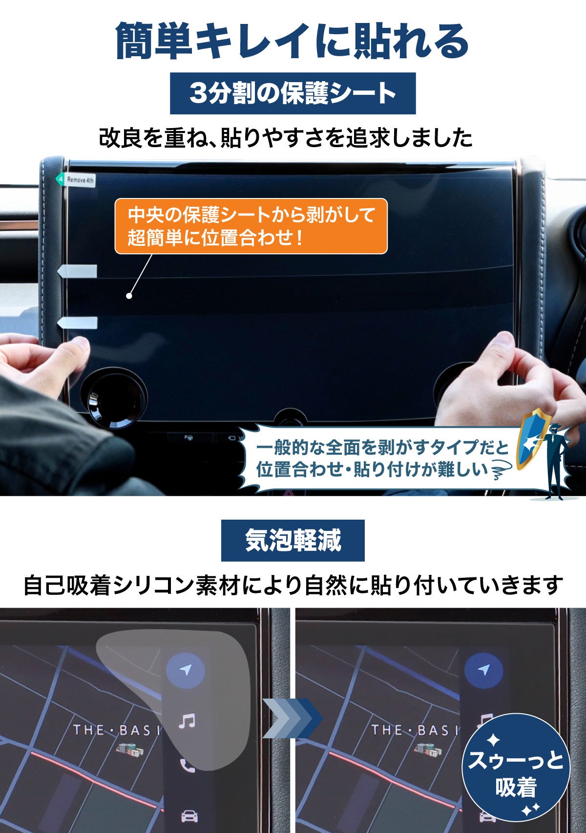 保護シートを「3分割」にすることにより、大きなナビ画面でも位置合わせがしやすく、簡単に貼り付けが可能です。また、フィルムの粘着面には特殊シリコン素材を採用。これによりフィルムは自己吸着し、気泡は入りづらく抜けやすくなります。