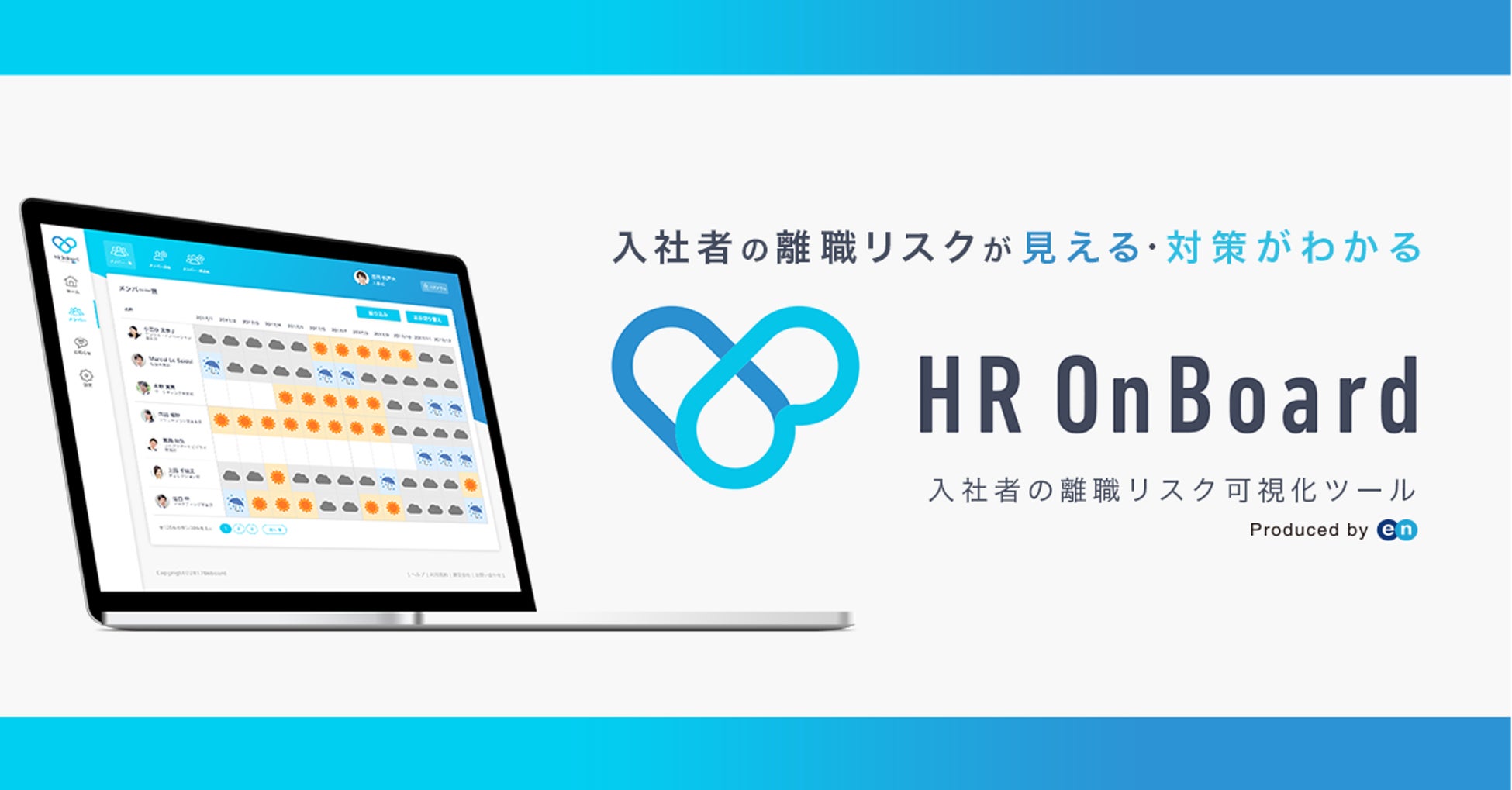 エン・ジャパンが提供するHR OnBoard(https://on-board.io/)は「入社後フォロー」をスマートに変える定着・活躍支援ツールです。入社後1年間、毎月の自動配信アンケートで社員のコンディションを見える化します。その結果から悩みを抱える社員がいればひと目でわかります。悩みを抱える新入社員を把握することができ、より少ない工数でフォローすることができます。