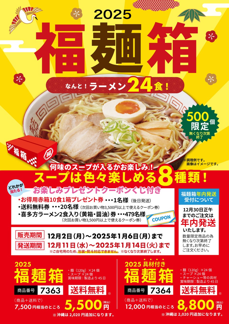 定番の醤油ラーメンや人気ラーメンをたっぷり詰め込んだ福袋、ならぬ「2025福麺箱」を発売中です。
