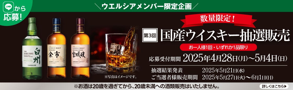 ウエルシア薬局株式会社(本社:東京都千代田区、代表取締役社長:田中純一、以下 ウエルシア薬局)は、ウエルシアグループのドラッグストア会社※1とともに、ウエルシアメンバーにご登録をいただいていますお客さまを対象に国産ウイスキーを抽選販売※2いたします。本抽選販売は昨年に引き続き3回目となり、4月28日(月)から5月4日(日)までの期間にウエルシアの公式LINEアカウントからご応募いただけます。 ※1 1部取り扱いのない会社と店舗がございます。
