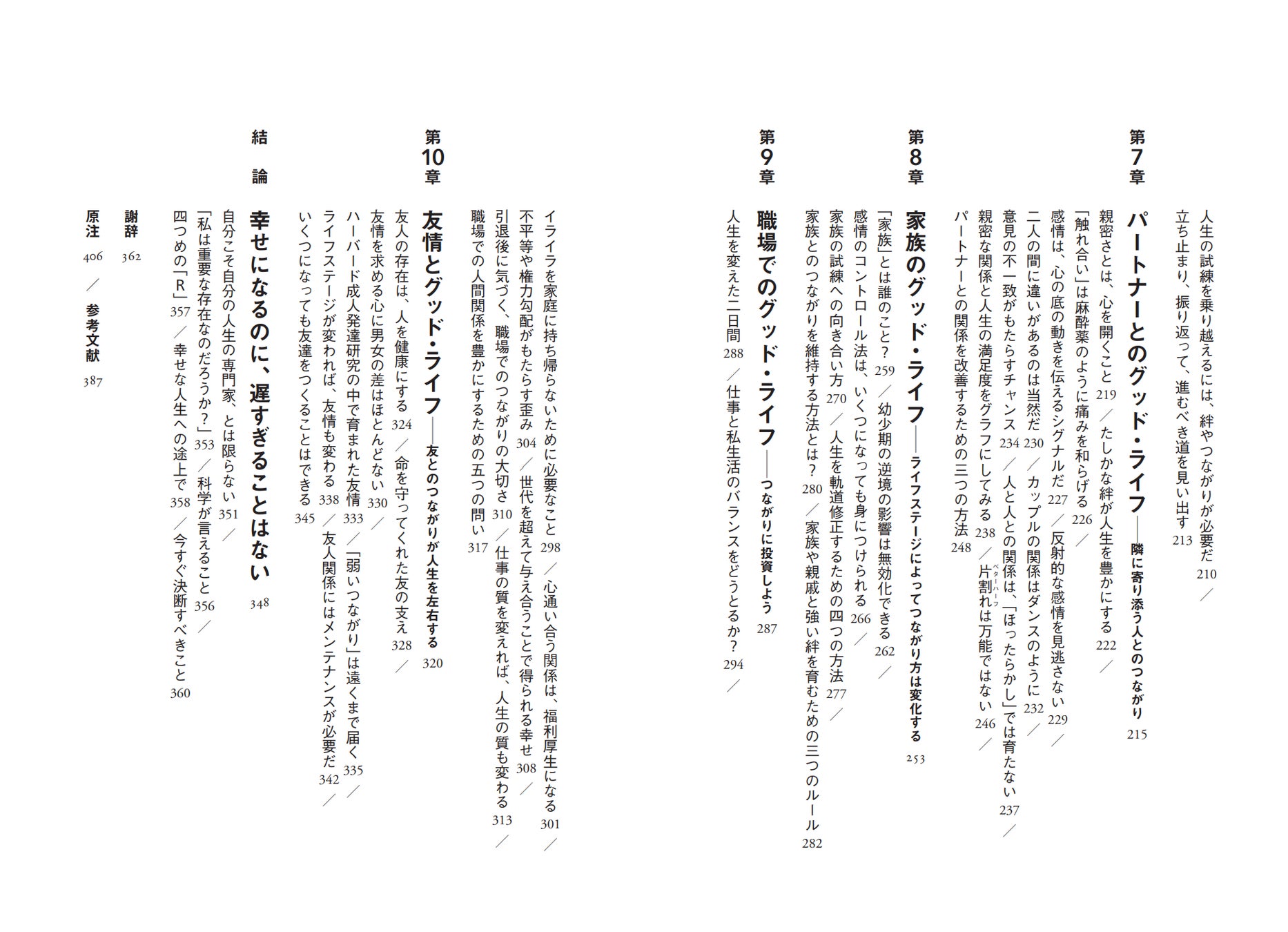 第7章以降では、家庭、夫婦や恋愛、職場など、人間関係を種類別に深く掘り下げる。長期にわたる親密な関係において大切なこと、子ども時代の家庭環境が幸福に与える影響とその対処法、見逃されていることの多い職場でつながりや、友情がもつ驚くほどのメリットを説明する。科学的根拠も提示するが、約一世紀にわたる本研究の被験者たちの実体験にも耳を傾けていく。