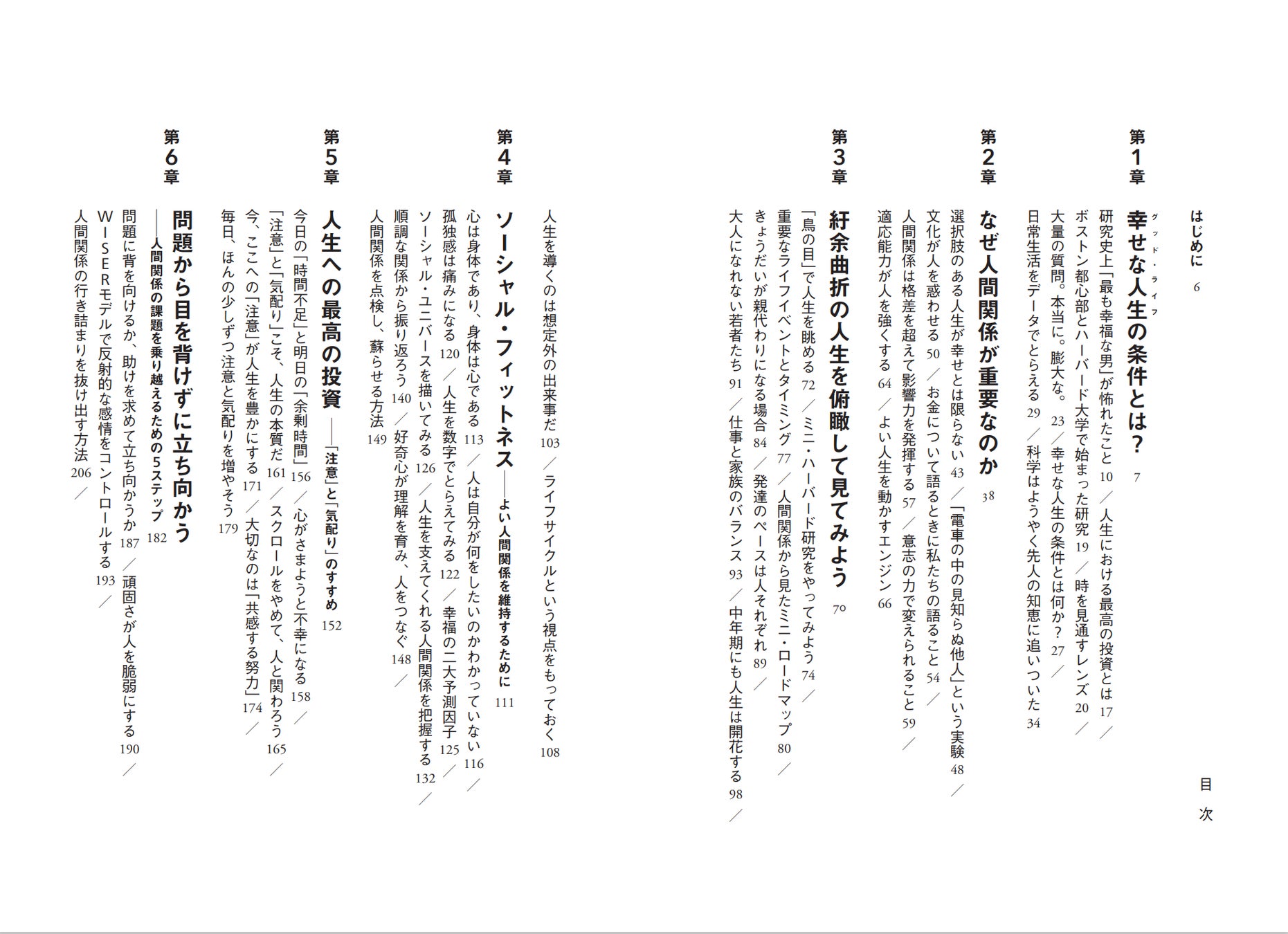 2000人以上の協力者の人生をもとに、“幸せは人生とは何か”また“なぜよい人間関係が必要なのか”、そして“どのように人間関係を築いていくべきなのか”までを丁寧に解説している。