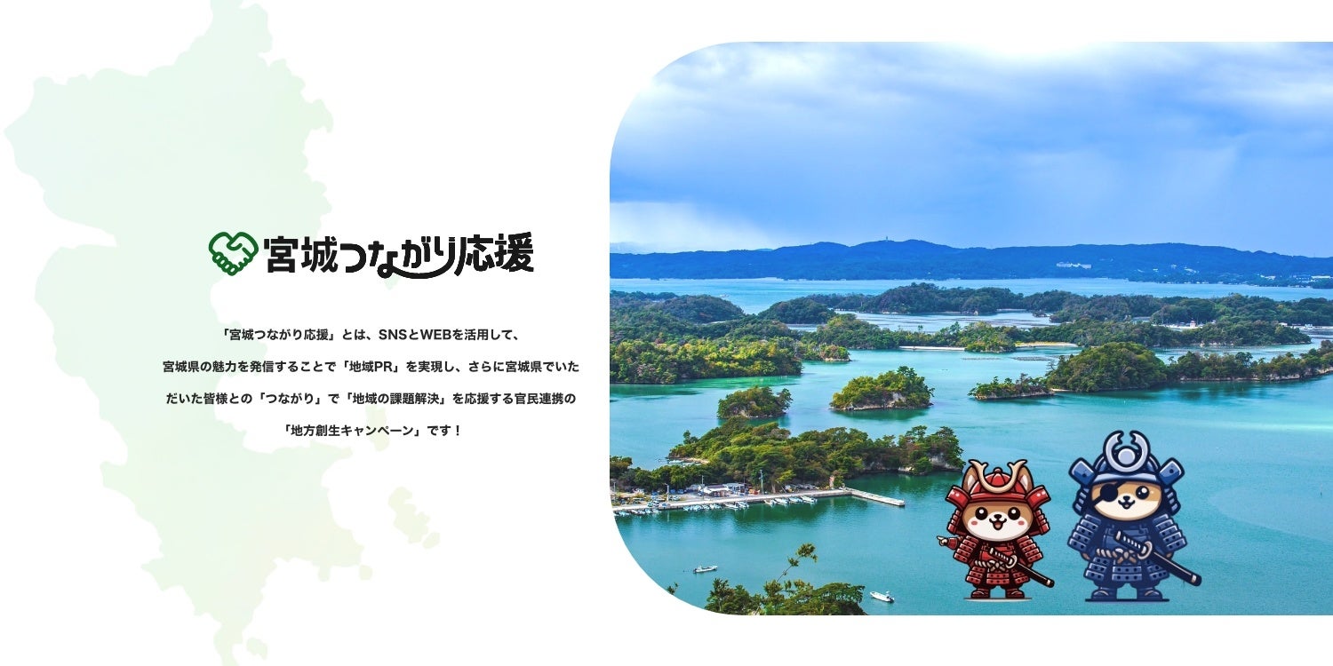 「宮城つながり応援」とは、SNSとWEBを活用して、宮城県の魅力を発信することで「地域PR」を実現し、宮城県でいただいた皆様との"つながり"で「地域の課題解決」を"応援"する官民連携の「地方創生キャンペーン」です!