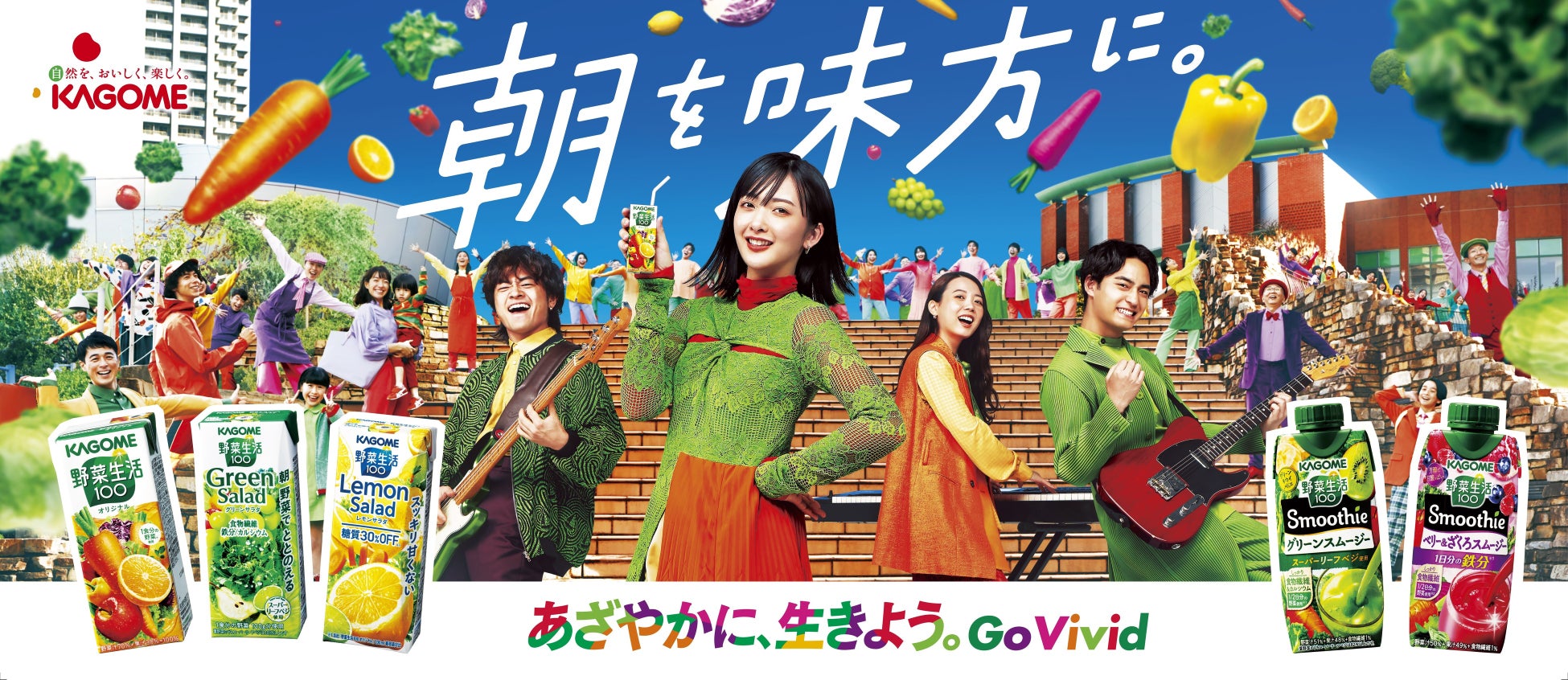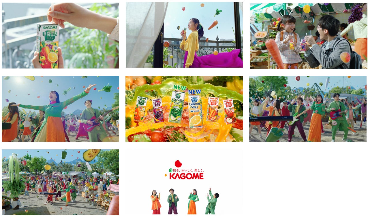 今回アンバサダーとなった緑黄色社会は、バンド名の由来が野菜ジュースであること、そして出身地がカゴメと同じ愛知県であること、さらに、国民的バンドを目指し老若男女から愛される様子が「野菜生活100」のありたい姿とマッチしたことから、起用に至りました。