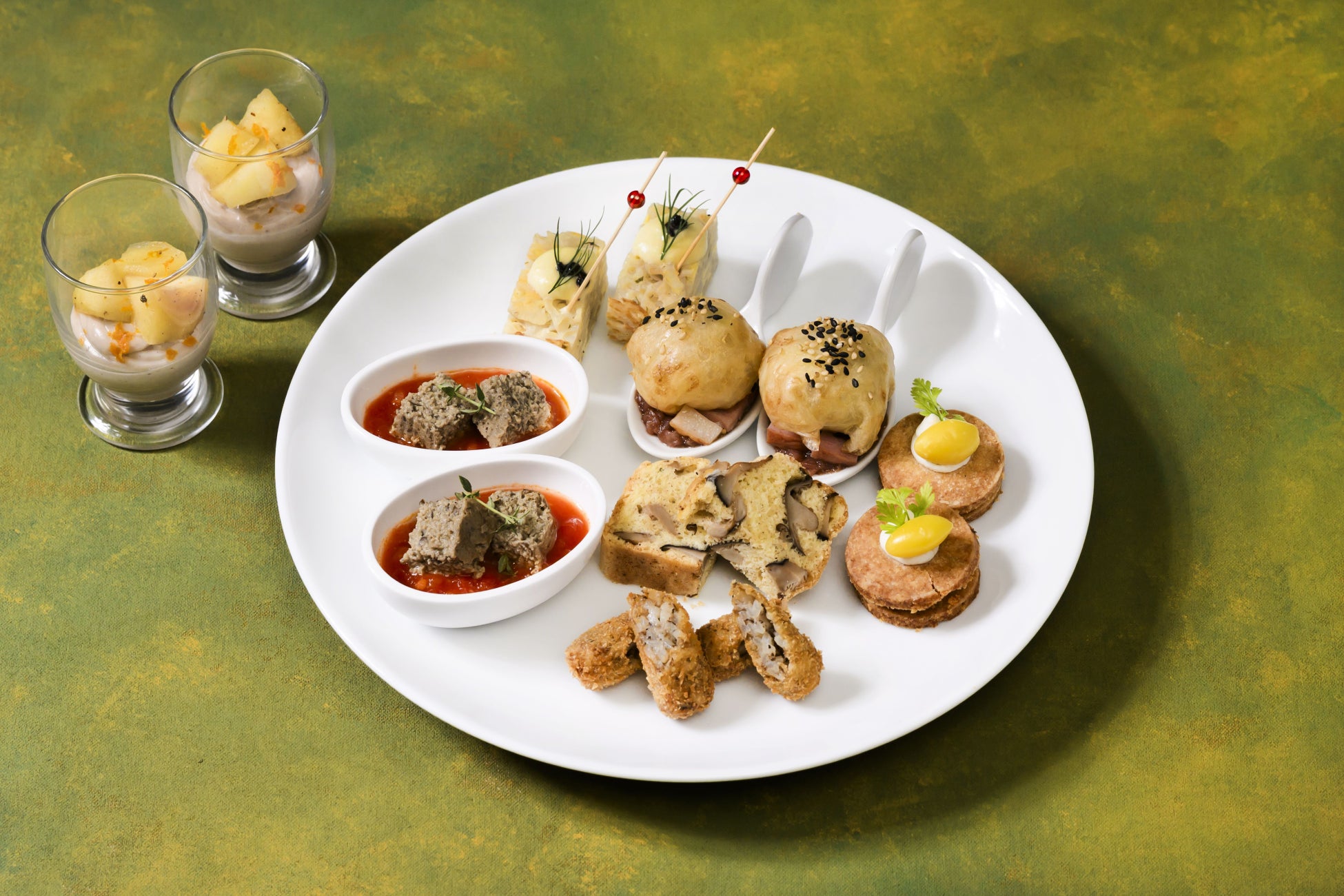 セイボリー7種:ライスコロッケ、ケークサレ、れんこんとパルミジャーノグラチネ、五郎島金時のフリットと鴨のロースト赤玉葱のジャム、栗のエスプーマと焼きリンゴ、桜エビのサブレ、秋ナスのパプトン トマトソース