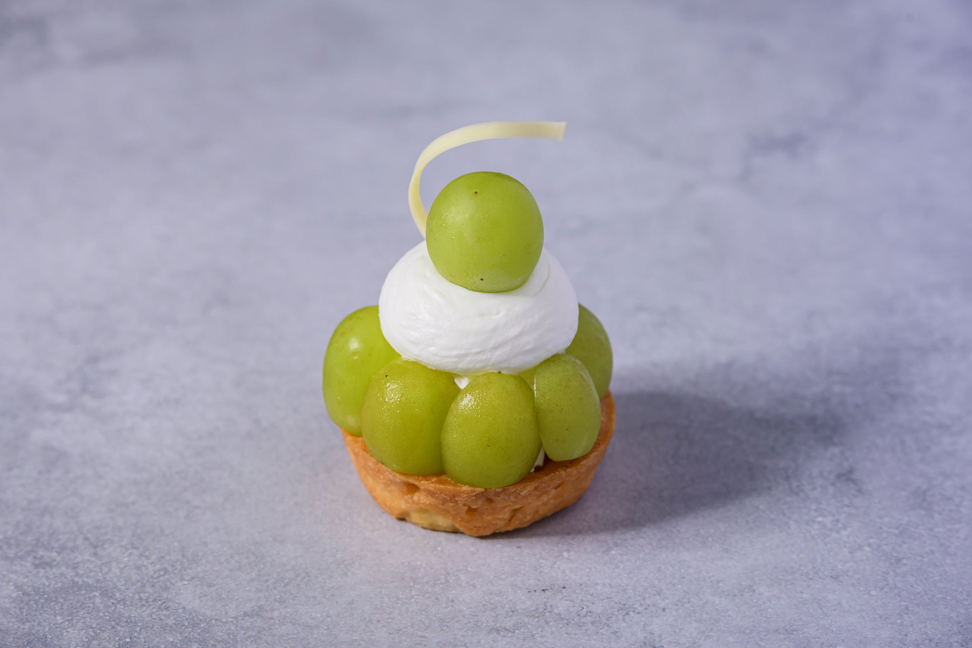 ぶどうの芳醇な香りを立たせたムースをビターなショコラムースに重ねた「ショコラレザン」。みずみずしいぶどうの甘美とカカオの奥行きが織りなす、艶やかな秋の余韻をお楽しみください。「シャインマスカットのタルト」は、サクッと軽やかなタルト生地になめらかなカスタードとクリームシャンティをとじ込め、シャインマスカットを贅沢にトッピング。ひとくち頬張れば、パリッと甘い翡翠のしずくが口いっぱいに広がります。