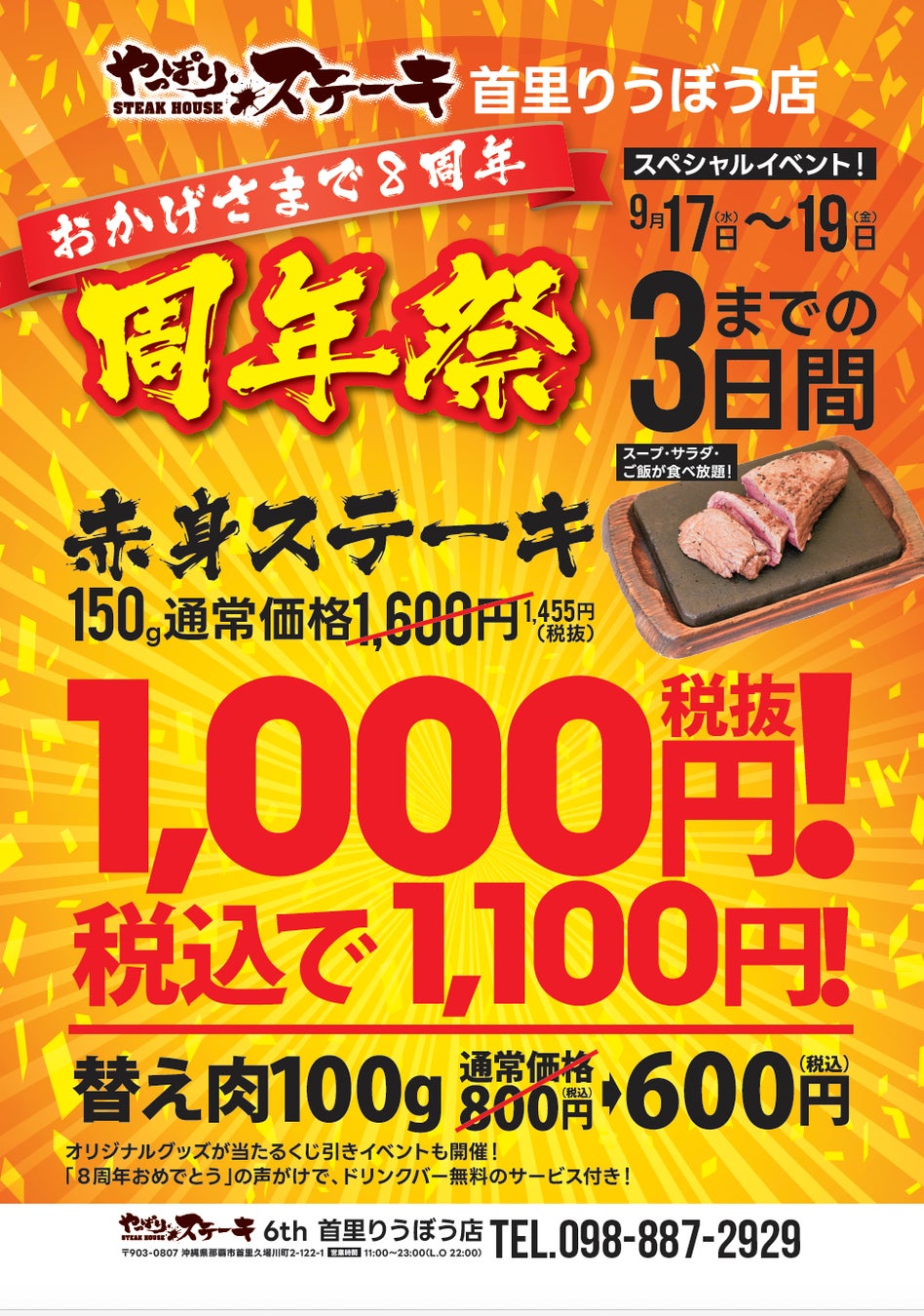 【やっぱりステーキ】周年祭だけのスペシャルプライス!やっぱりステーキ 6th首里りうぼう店が8周年
