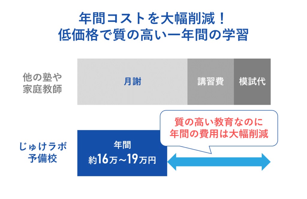 年間の塾や家庭教師費用というのは、単なる月謝の12倍というわけではありません。季節ごとの講習や教材費、模試費用など、多くの費用が発生します。これに対して、じゅけラボ予備校は月額を通年で計算しただけのシンプルでリーズナブルな料金設定なので、年間費用は約16万8,960円〜19万5,360円(最難関コースは特別料金が別途発生)です。教育の質を維持しつつ、年間の費用を大幅に削減したい保護者には、最適な選択肢となり得ます。