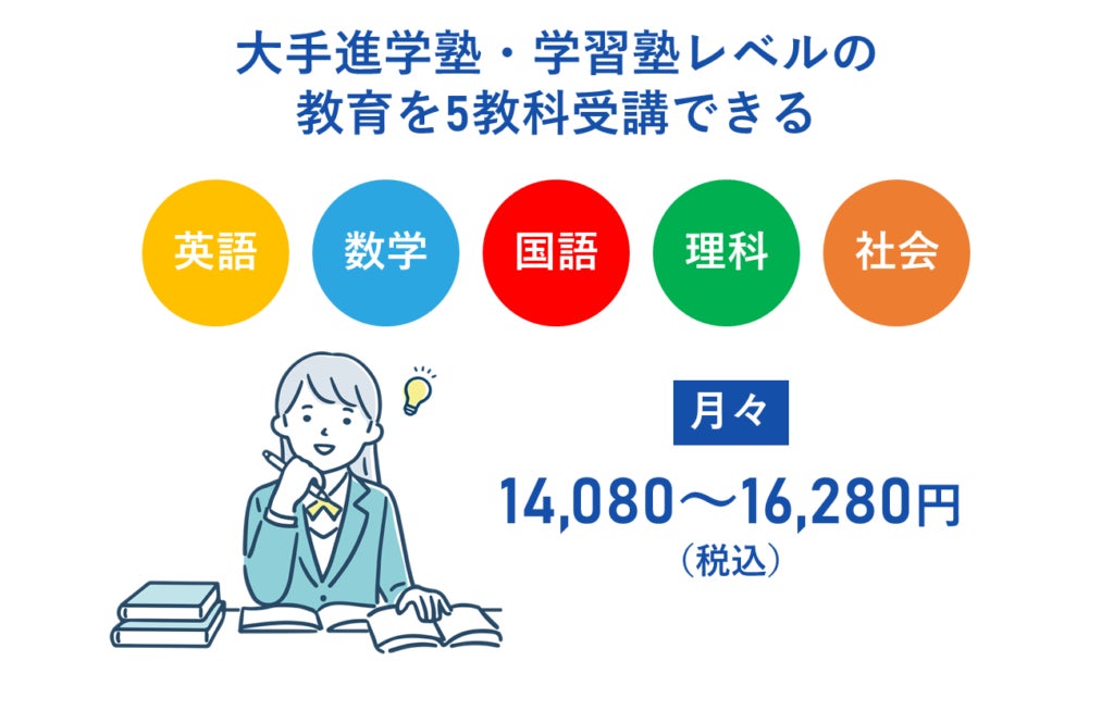月額14,080円~16,280円(税込)で大手進学塾・学習塾レベルの教育を5教科受講できる