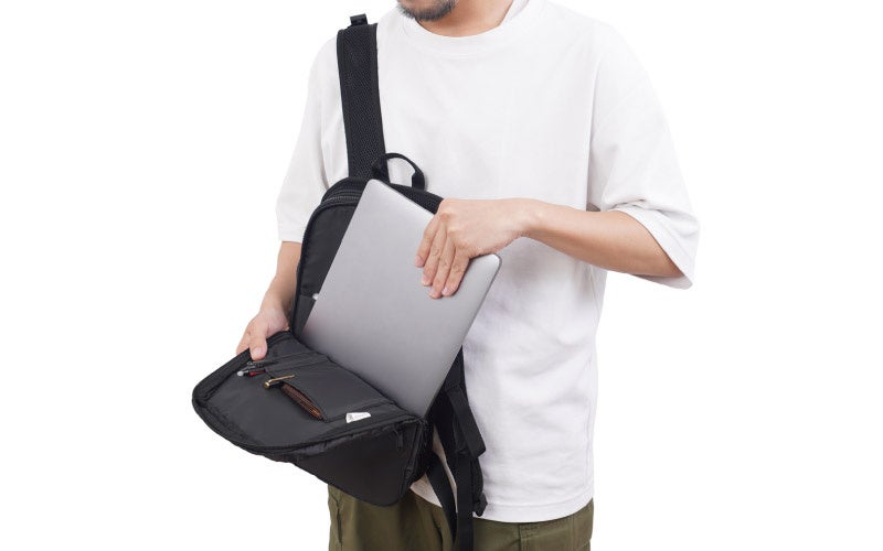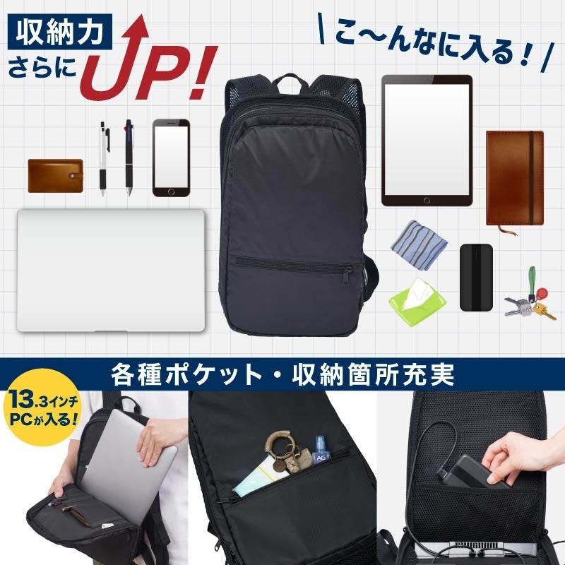USB給電式。お手持ちのモバイルバッテリーで使用可能。10000mAhのモバイルバッテリー使用時は強モードで約3時間、弱モードで約4時間動作可能。ペルチェ搭載部、物が入れられるメインポケット部で構成された2層構造。メインポケット部分には13.3インチのパソコンが収納できます。外側には小物が入れられるポケット付。