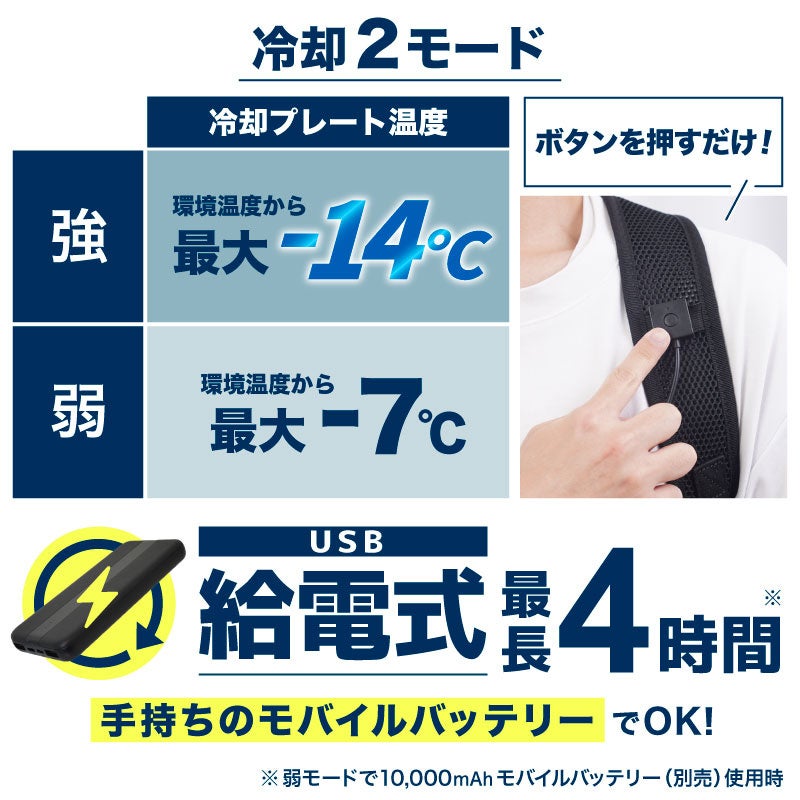 有線コントローラーの電源ボタンを押すと、冷却プレートが冷却。環境温度(周辺温度)から-14度に冷却されたプレートが背中に当たって冷たく感じられます。強弱2段階の切り替えが可能。コントローラー部はベルト部分に引っ掛けられます。