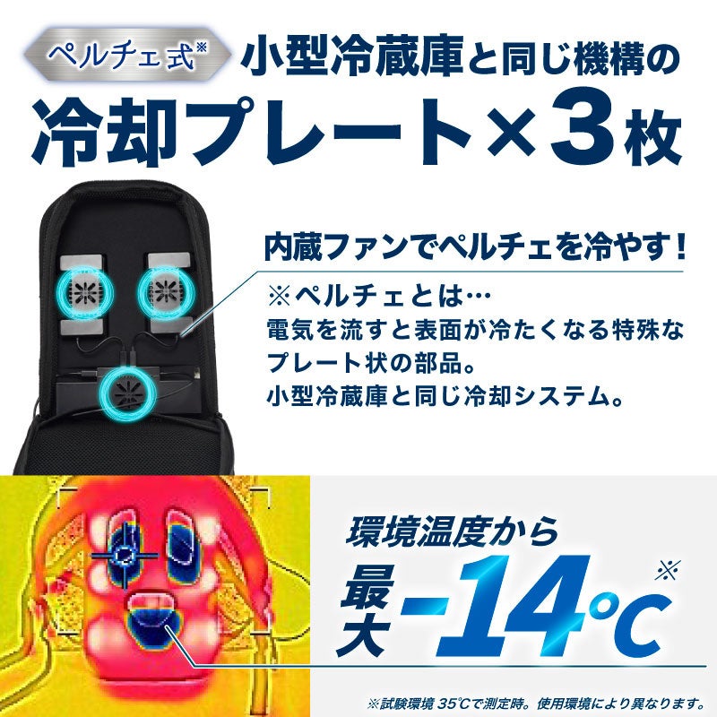 本製品は大きな3枚の冷却プレートを搭載したリュック型のウェアラブルクーラーです。リュックの背中に当たる部分に3か所ペルチェ式冷却プレートを搭載。