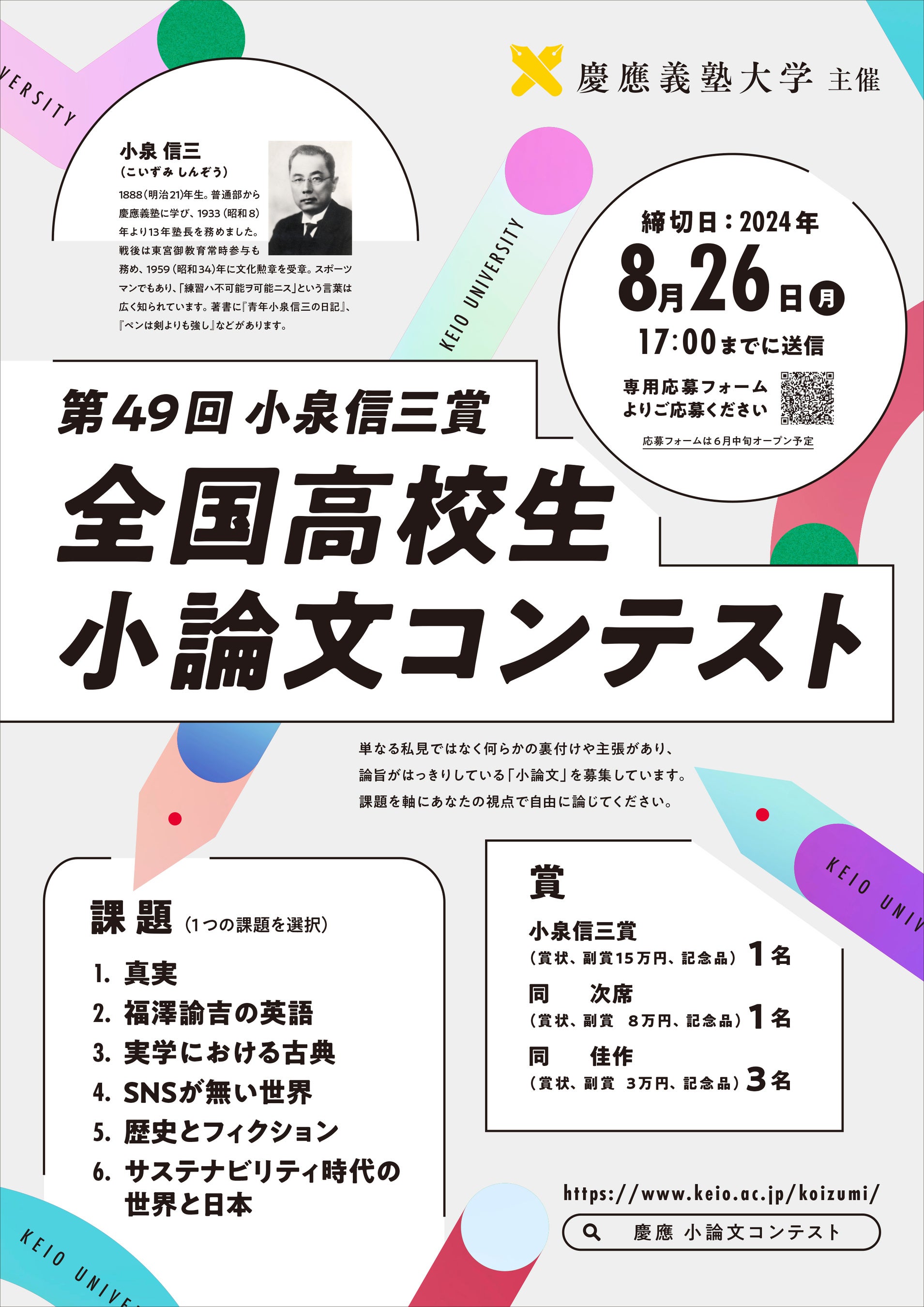 【慶應義塾】慶應義塾大学主催 第49回小泉信三賞全国高校生小論文コンテストのお知らせ