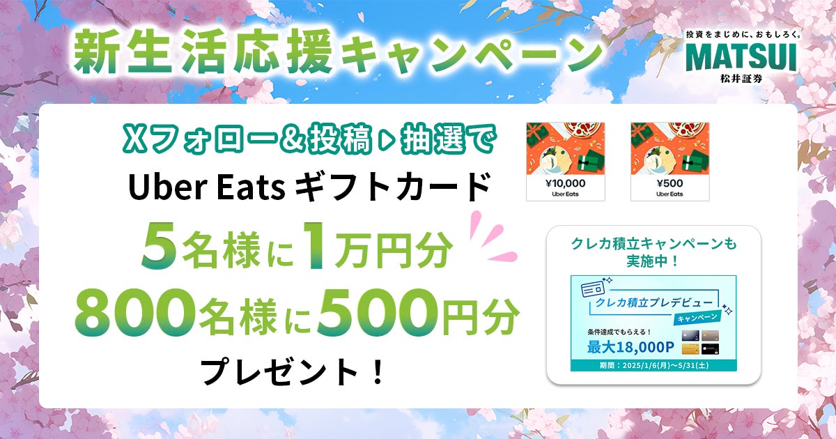 キャンペーン期間中に、当社Xアカウント(@Matsui_PR)をフォローの上、キャンペーン投稿から「始めてみたい春のマネ活」を選んで投稿した方のうち、抽選で5名様に1万円分、800名様に500円分の Uber Eats ギフトカードをプレゼントします。