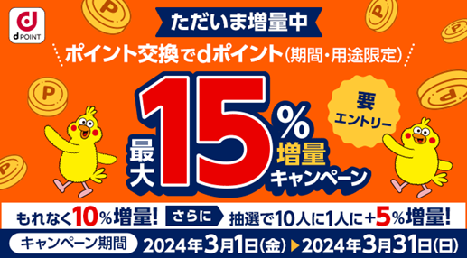 キャンペーン名 | ポイント交換でdポイント最大15%増量キャンペーン ~もれなく10%増量!さらに抽選で10人に1人+5%あたる~ |
