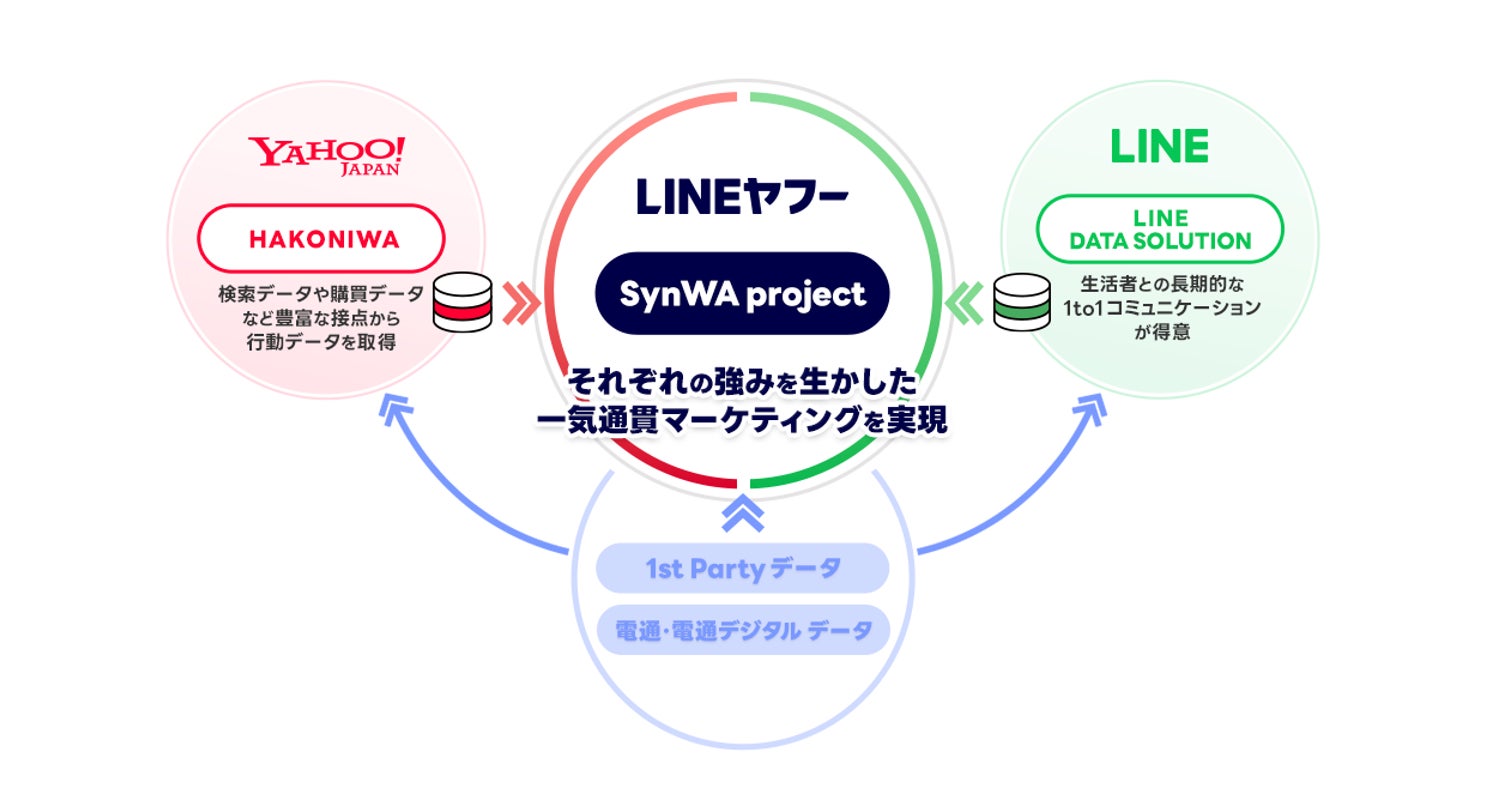 株式会社電通デジタル(本社:東京都港区 代表取締役社長執行役員:瀧本 恒 以下、電通デジタル)は、株式会社電通(本社:東京都港区 代表取締役 社長執行役員:佐野 傑 以下、電通)、LINEヤフー株式会社(本社:東京都千代田区 代表取締役社長 CEO:出澤 剛 以下、LINEヤフー)と、「SynWA project(シンワ プロジェクト)」を発足させ、LINEヤフーのビッグデータと電通デジタル・電通が保有・連携するデータを活用した、新たな分析ソリューションの提供を本日より開始します。