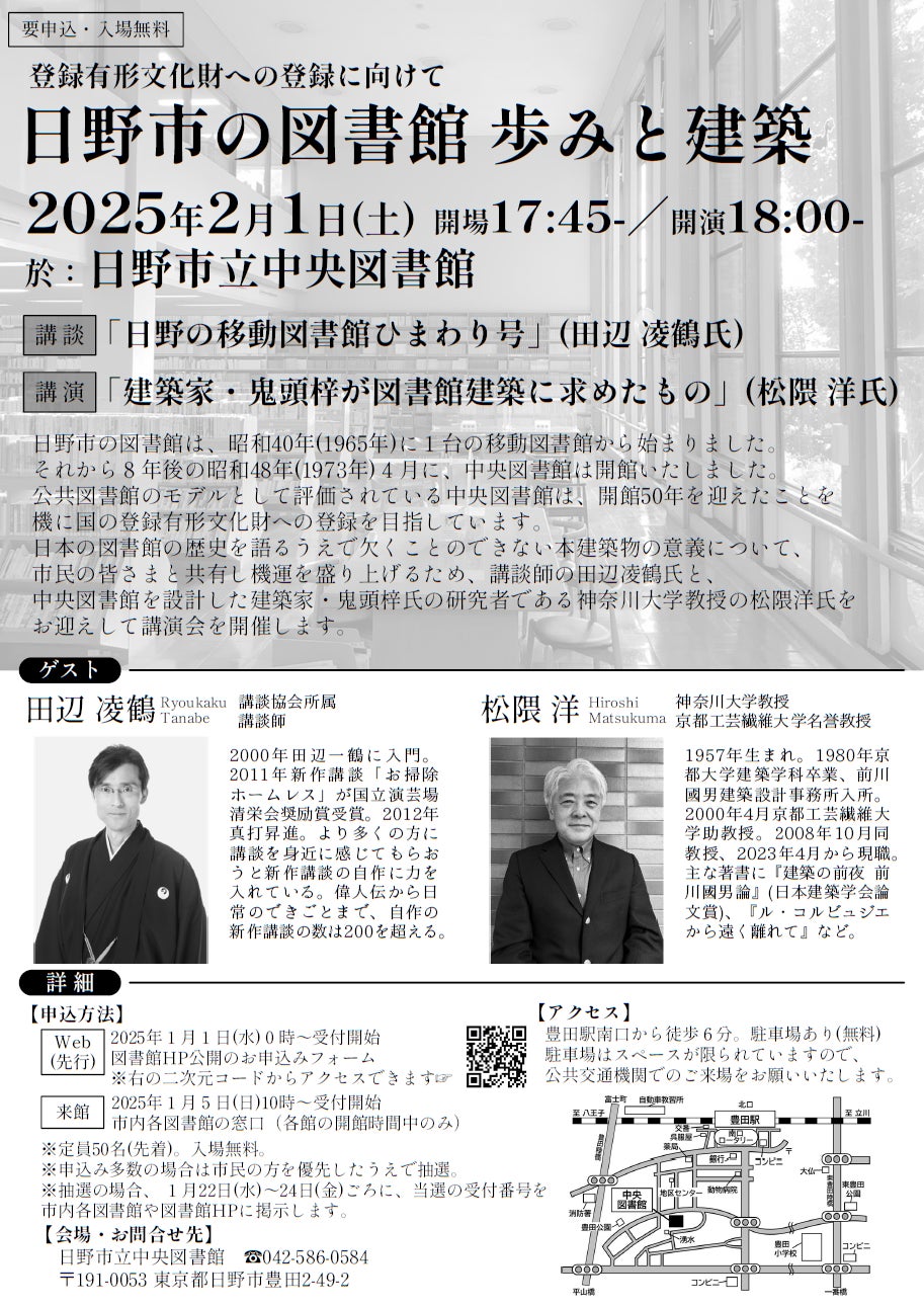 日本の図書館の歴史を語るうえで欠くことのできない本建築物の意義について、市民の皆さまと共有し機運を盛り上げるため、講談師の田辺凌鶴氏と、中央図書館を設計した建築家・鬼頭梓氏の研究者である神奈川大学教授の松隈洋氏をお迎えして講演会を開催します。