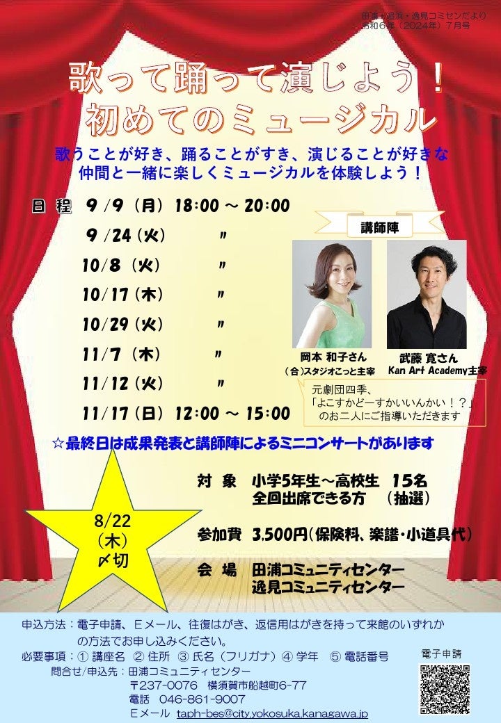 田浦・追浜・逸見コミセン講座『歌って踊って演じよう!初めてのミュージカル』は、元劇団四季、“よこすかどーすかいいんかい!?”を率いる岡本和子さんと武藤寛さんを講師に迎え、ミュージカルの楽しさ、面白さを体験できる講座です。