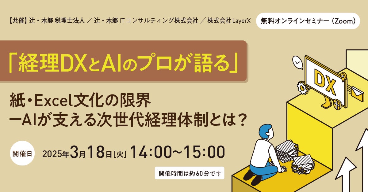 辻・本郷 税理士法人(本社:東京都新宿区、理事長:桑木小恵子)は、辻・本郷 ITコンサルティング株式会社(本社:東京都渋谷区、代表取締役社長:黒仁田健)、株式会社LayerX(代表取締役CEO:福島良典、代表取締役CTO:松本勇気)と共催で、2025年3月18日(火)14:00より「『経理DXとAIのプロが語る』紙・Excel文化の限界—AIが支える次世代経理体制とは?」セミナーを、Zoomを使用したオンラインで開催いたします。本セミナーでは、経理DXのプロである辻・本郷 ITコンサルティングとAIのプロであるLayerXが、最新のAIのトレンドを踏まえ、経理業務におけるAI活用事例や使い分け、経理業務を効率化するための実践的なノウハウをご紹介します。紙・Excelからの無理のない脱却ロードマップや、AIを駆使した最新のシステムにご興味のある方にお勧めのセミナーです。