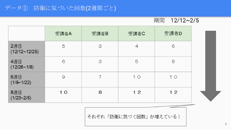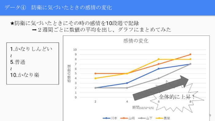 セルフエスティームが上がったと断定することは難しいが、防衛に気づくことは自己肯定感にポジティブな影響を与えたということが検証できました。