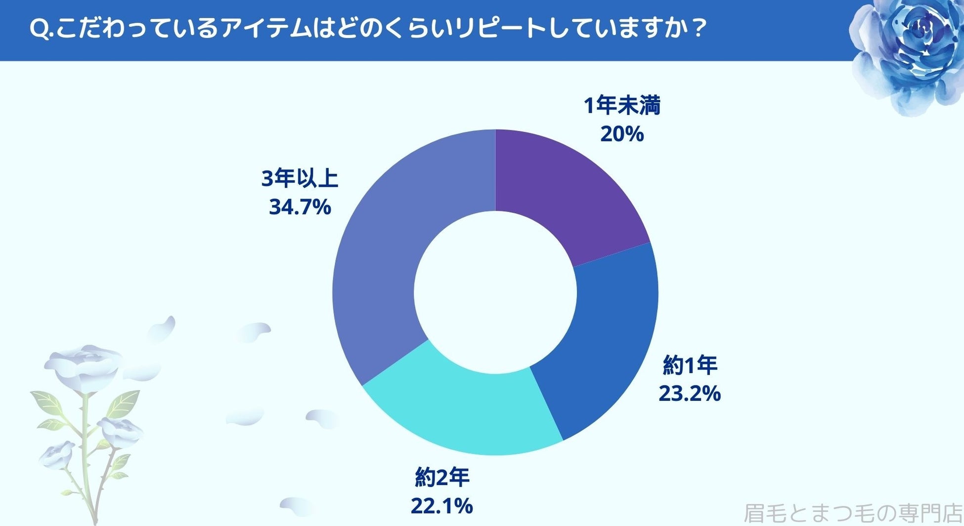 こだわっているアイテムはどのくらいリピートしているかお聞きしたところ「1年未満(20%)」、「約1年(23.2%)」、「約2年(22.1%)」、「3年以上(34.7%)」という結果になりました。