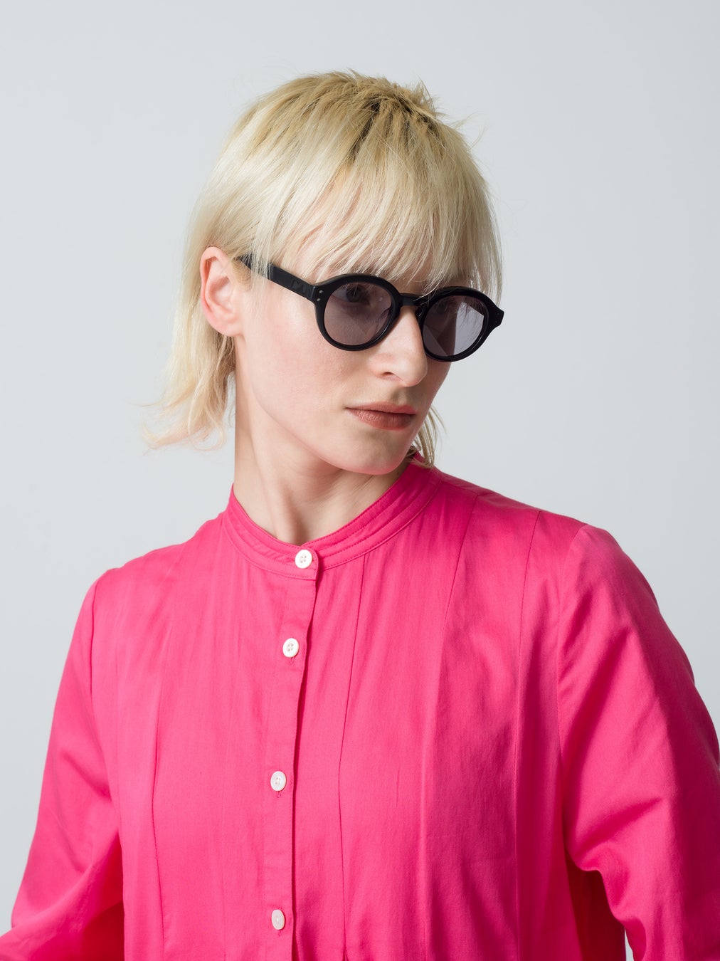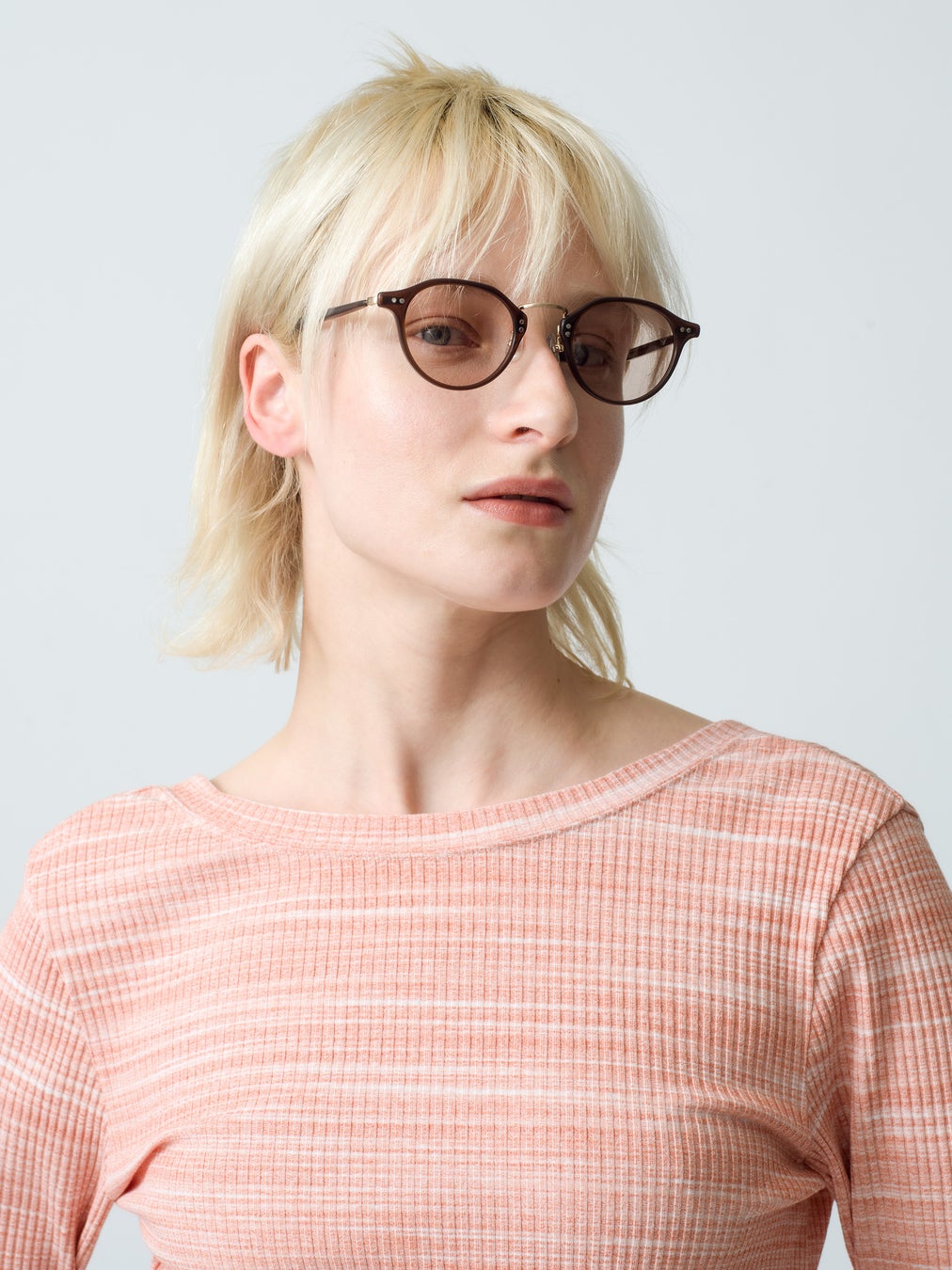 表情を柔らかく見せてくれる、クラシカルな印象のラウンド型サングラス。鼻にかかるブリッジ部分と外側の智の高さを変えることでモダンな印象に。智部分に横に並べられた二つの鋲は、ヨーロッパヴィンテージフレームを彷彿とさせる、シンプルでありながらナードなデザインに落とし込んでいます。