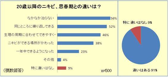 また20代女性の9割が、大人ニキビと思春期ニキビに違いがあるとした。具体的には、「なかなか治らない」(56%)、「同じところに繰り返しできる」(52%)を特徴として指摘する人が多い。