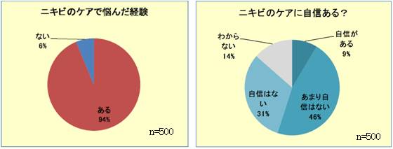 ニキビのケアに悩んだ経験がある人は94%に上る一方、自分のケア方法に自信を持っている人はわずか9%に過ぎない。