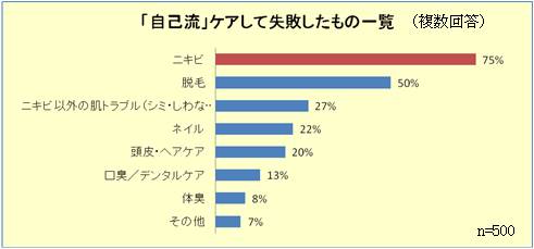 75%が自己流のニキビケアで失敗した経験を持ち、脱毛(50%)、シミ・しわなどニキビ以外の肌トラブル(27%)といった他の20代女性に一般的と思われる日常的なケアの中で、最も高い失敗経験率となった。