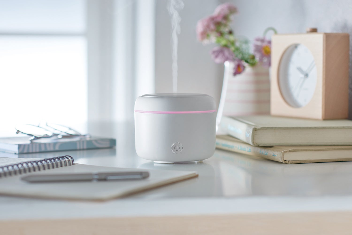 ベッドサイドやデスク周りなどのパーソナルスペースに最適な手のひらサイズ。小さくコロンとしたフォルムで、コンパクトにアロマの香りを楽しめます。様々な場所で使用しやすいUSB給電式。インテリアに調和するシンプルなデザインも特長です。