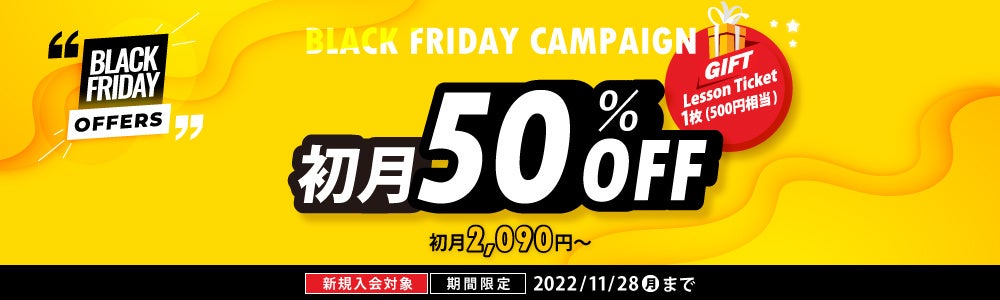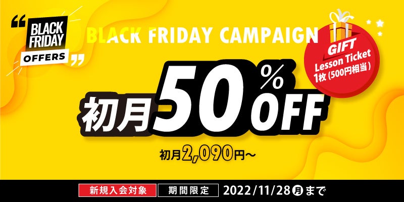 無料体験レッスン(※)受講後、ご入会をご希望の場合は、キャンペーン期間内に有料会員登録をしてください。初月半額となります。