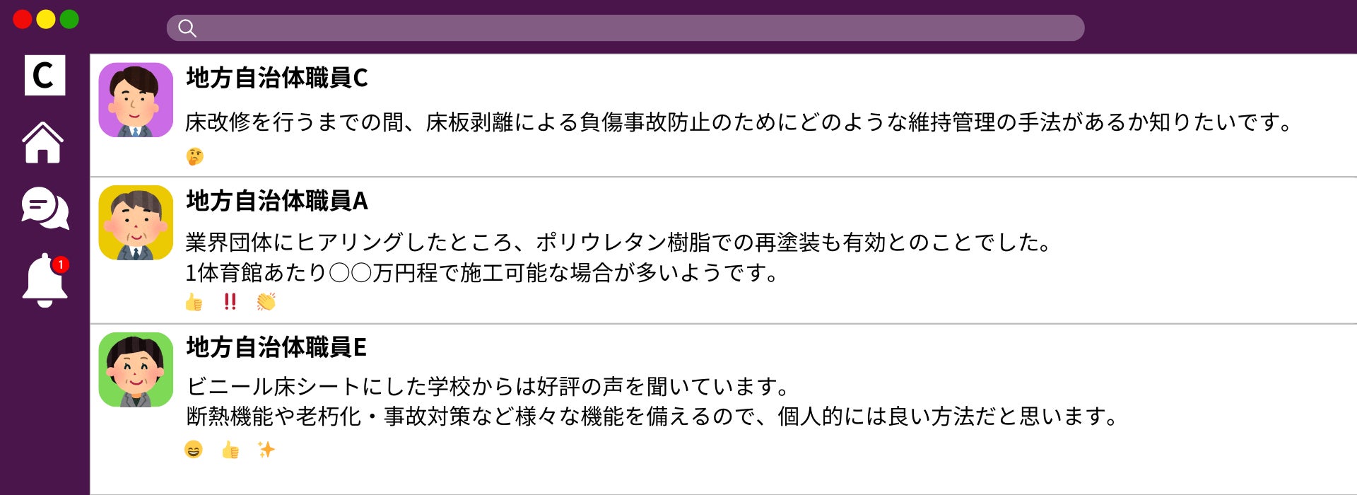 教室レイアウト、トイレ改修、ICT環境、バリアフリーなど、日々の悩みをそのまま投稿。コミュニティ内では、他の自治体の担当者から事例紹介やコメントが寄せられ、実務に活かせるヒントが得られます。