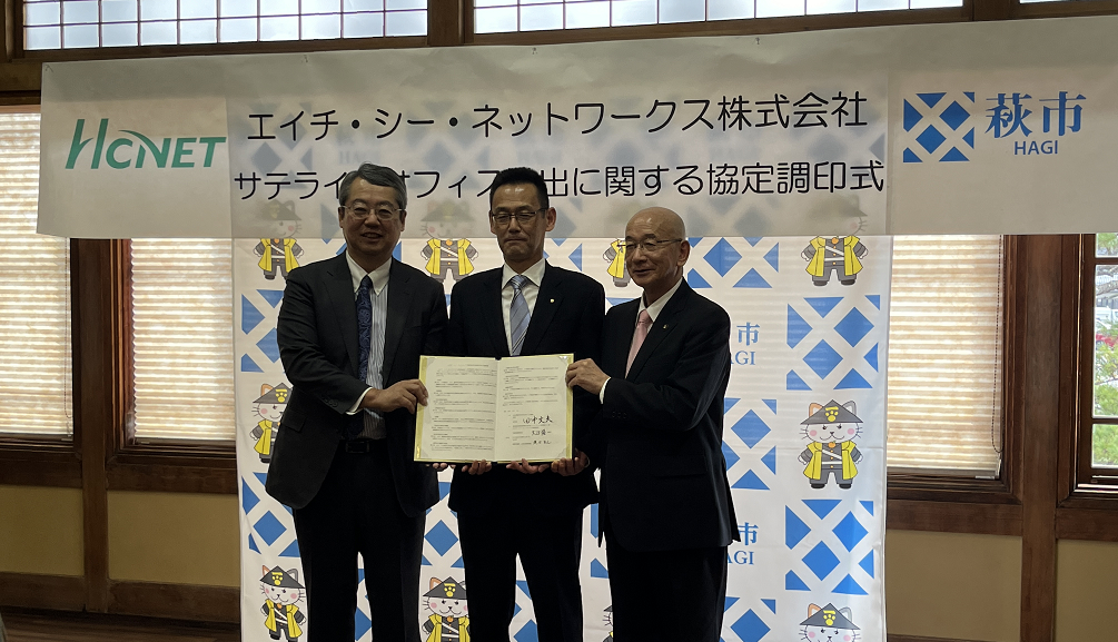 (写真は左からエイチ・シー・ネットワークス株式会社 大江愼一社長、山口県産業労働部 縄田浩之企業立地統括監、田中文夫市長)
