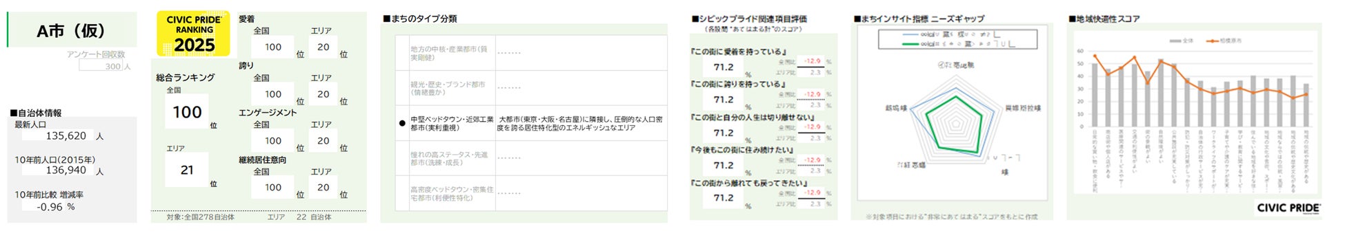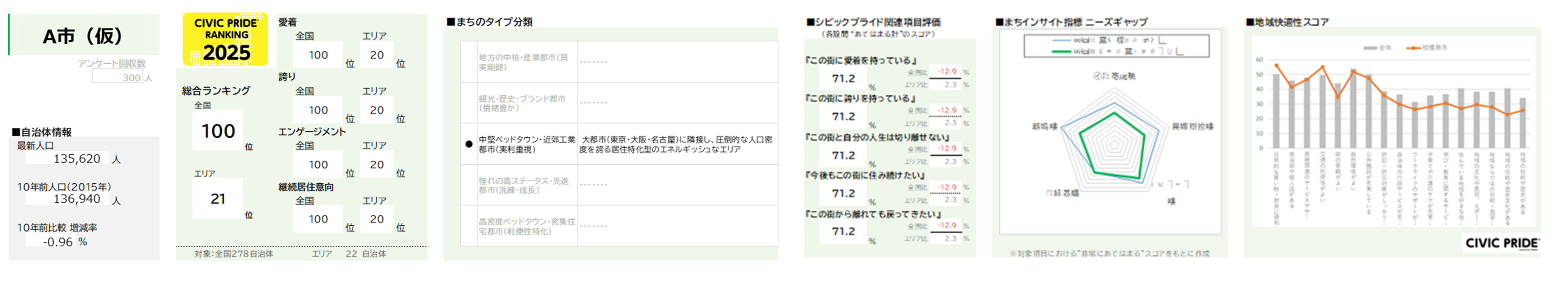 他自治体とのスコア比較、ターゲット別での分析、まちインサイト5指標の詳細スコア、シビックプライドと関係人口/地域経済指標との関係性、調査結果に基づいた戦略方向性の提示など、より詳細なレポートも今後有償にて提供する予定です。