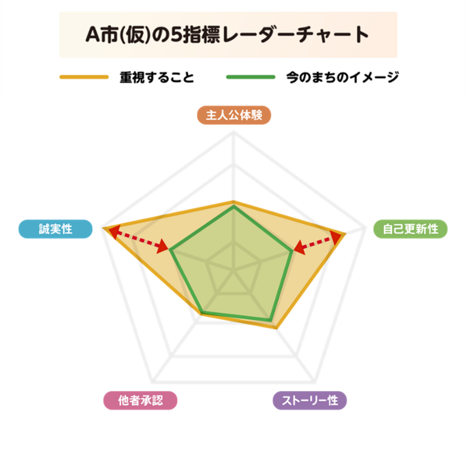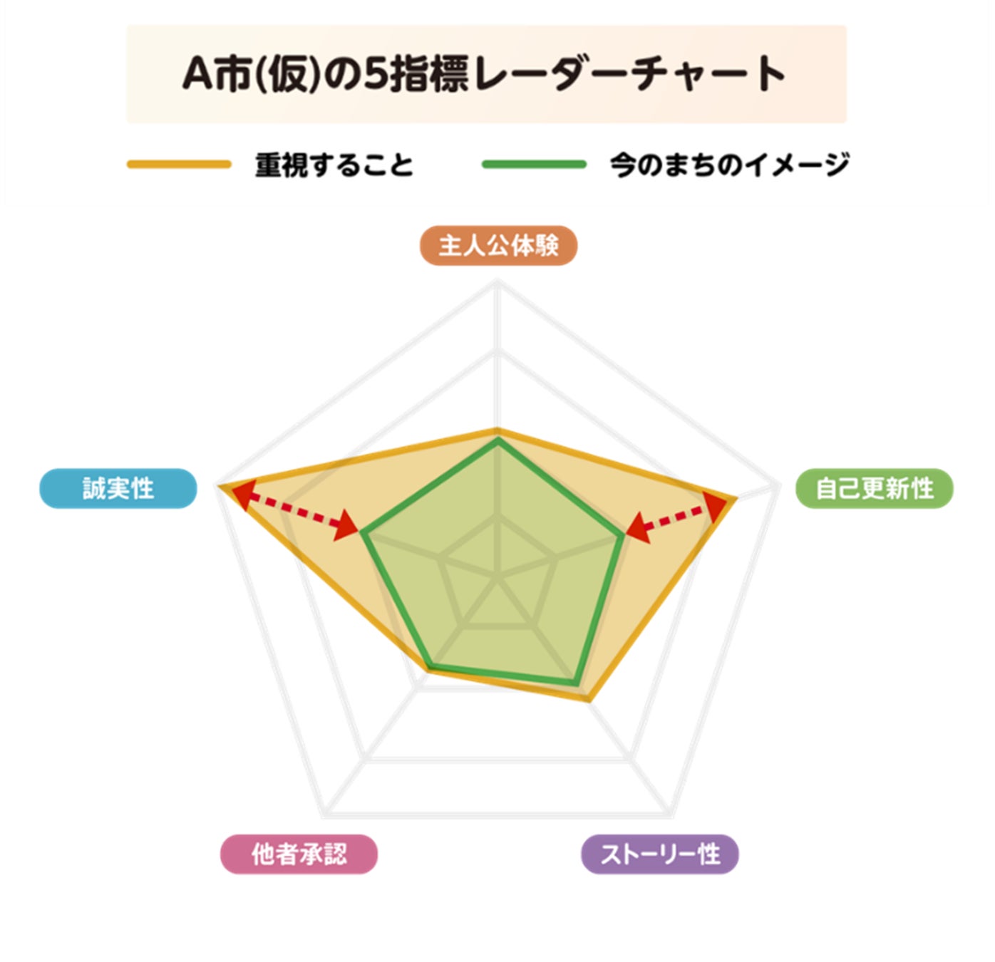 5指標はそれぞれ「主人公体験(当事者意識)」「自己更新性(成長・刺激)」「ストーリー性(地域の物語)」「他者承認(外部評価)」「誠実性(安心・包摂)」で構成され、各自治体における地域未来戦略を具体化し、政策投資の優先順位づけやまちの基本方針づくりに活用できるとともに、実施施策が住民にどこまで届いているか、取り組み成果の効果測定にも役立ちます。