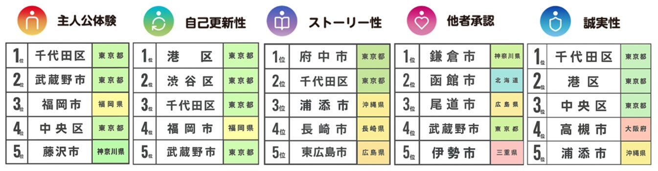 歴史や伝統、文化や芸術、スポーツやエンターテインメントなど、そのまち固有の物語性や独自コンテンツの充実度を示す「ストーリー性」指標では、府中市(東京都)がトップとなりました。他にも浦添市(沖縄県)、長崎市(長崎県)、東広島市(広島県)など比較的人口規模の小さな自治体が上位に並んでいます。これらの結果は、大都市ではない自治体であっても、まちへの愛着や誇りを育み、地域経済を活性化させるための資産として「ストーリー性」が機能し得る可能性を示唆しています。一方、「ストーリー性」が低い自治体にとっては、まちの魅力を再発見し強化するための指針として、5指標を活用できると考えられます。