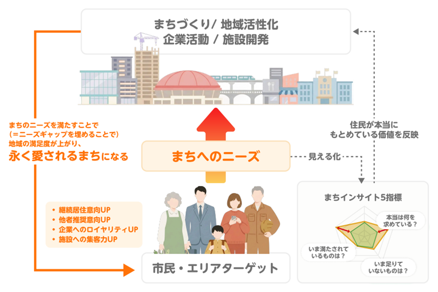 「まちインサイト5指標」は、現状を“数字で終わらせない”ためのデータです。単に課題を示すだけでなく、住民が本当に求めている価値を、具体的にまちに反映するための企画設計に使えることが大きな特徴です。