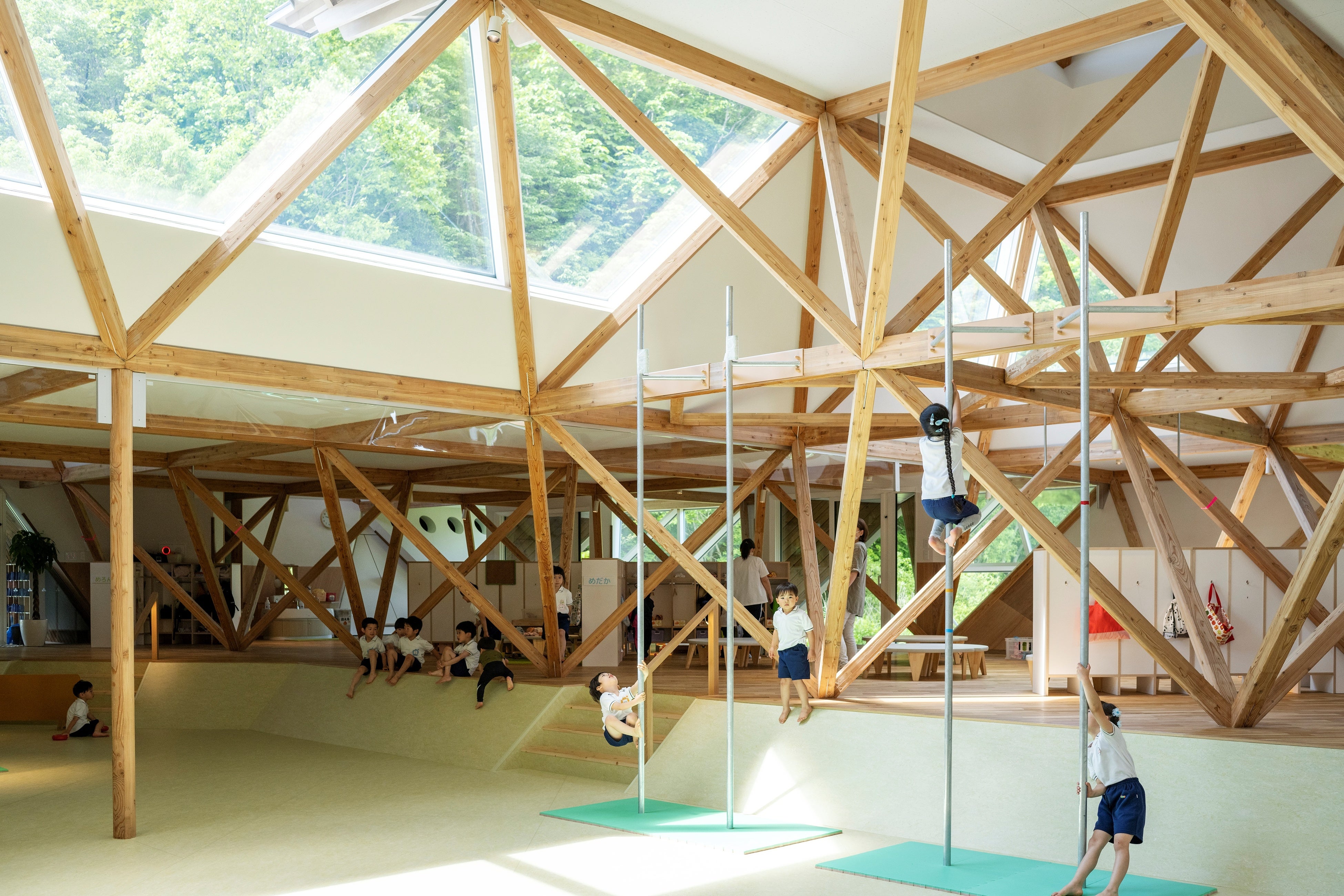 「浦河フレンド森のようちえん」は、その名のとおり、自然体験を通じての学びを重視しています。園舎に隣接する8ヘクタールに及ぶ「かしわの森」はもちろん、木材がふんだんに使われた園舎(2022年度「北海道赤レンガ建築賞」受賞)も自然的。森で出会う植物や生き物を題材にどう遊ぶか、園舎の建物自体を遊具にして柱や梁によじ登ったりするのも自由。子どもたち主体の学びを促しており、だんだんと「遊びの達人」へ成長していきます。