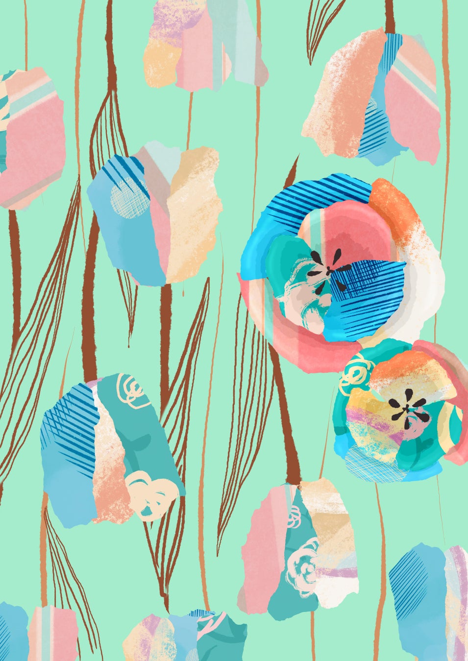 花びらは実際に花びらの形に破いた紙の形に、花びら用に作成した絵柄を入れ、貼り絵のように見えるように工夫しています。