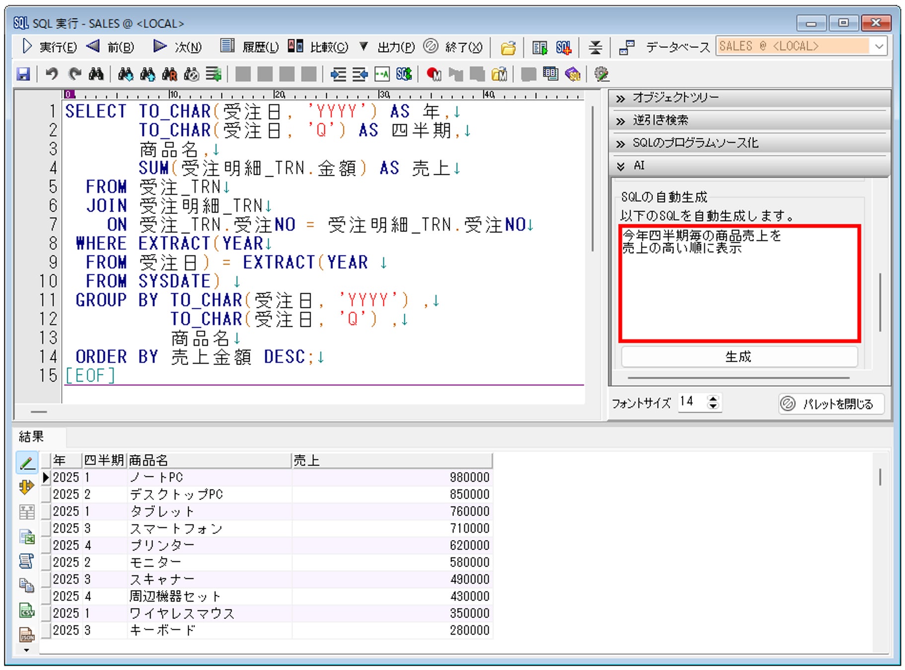 日本語のプロンプト(指示文)よりSQLを生成する機能です。作成済のテーブル情報を分析の上 、最適なSQLを生成しますので、SQLの知識がなくても、抽出したい内容を記述するだけでデータ抽出が可能です。