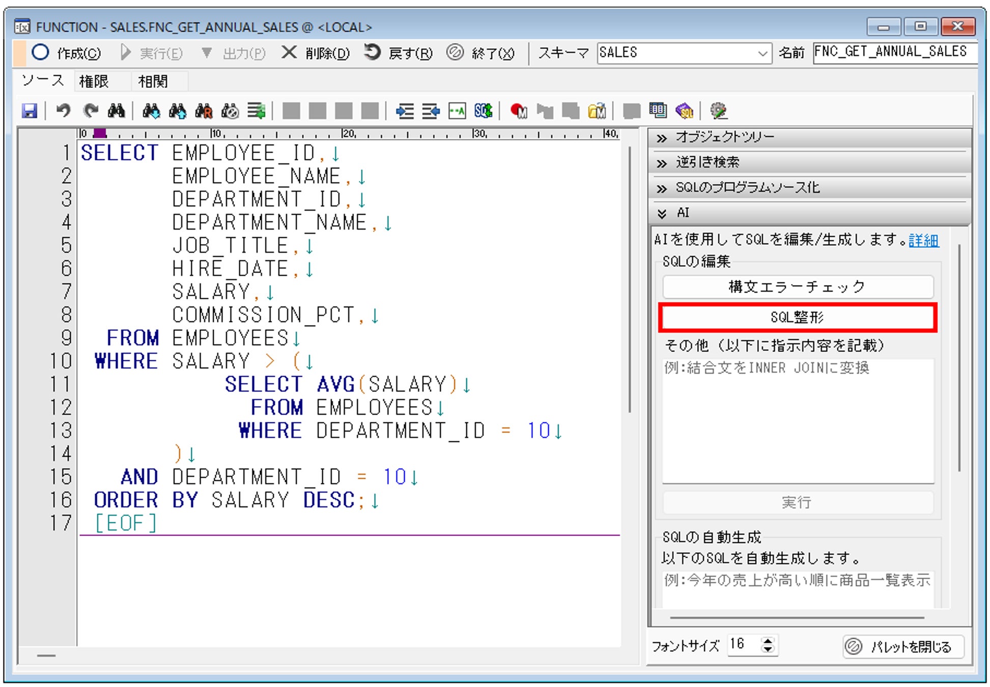 SQLの改行やインデントなどのフォーマットを整え、SQLを見やすくする機能です。