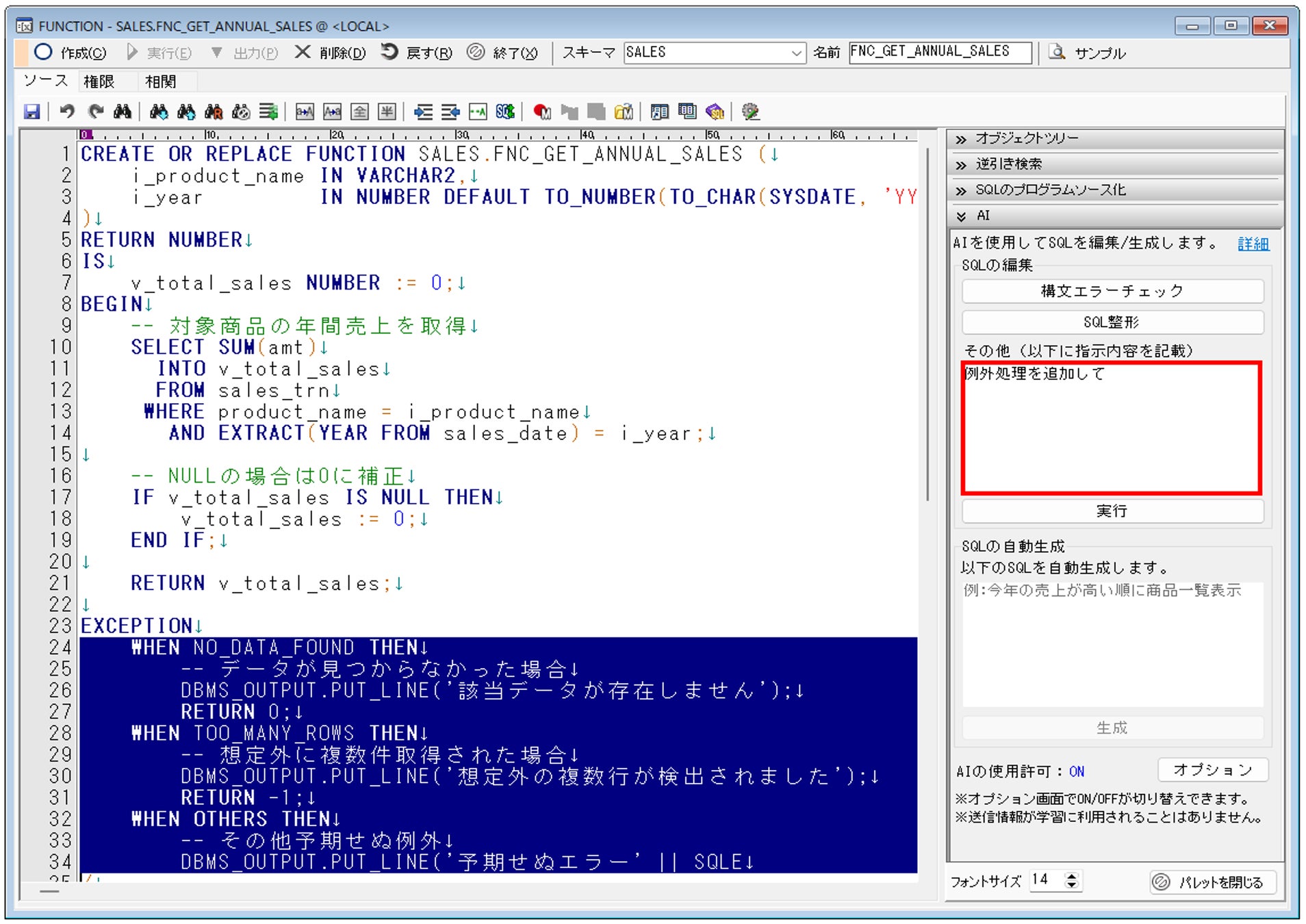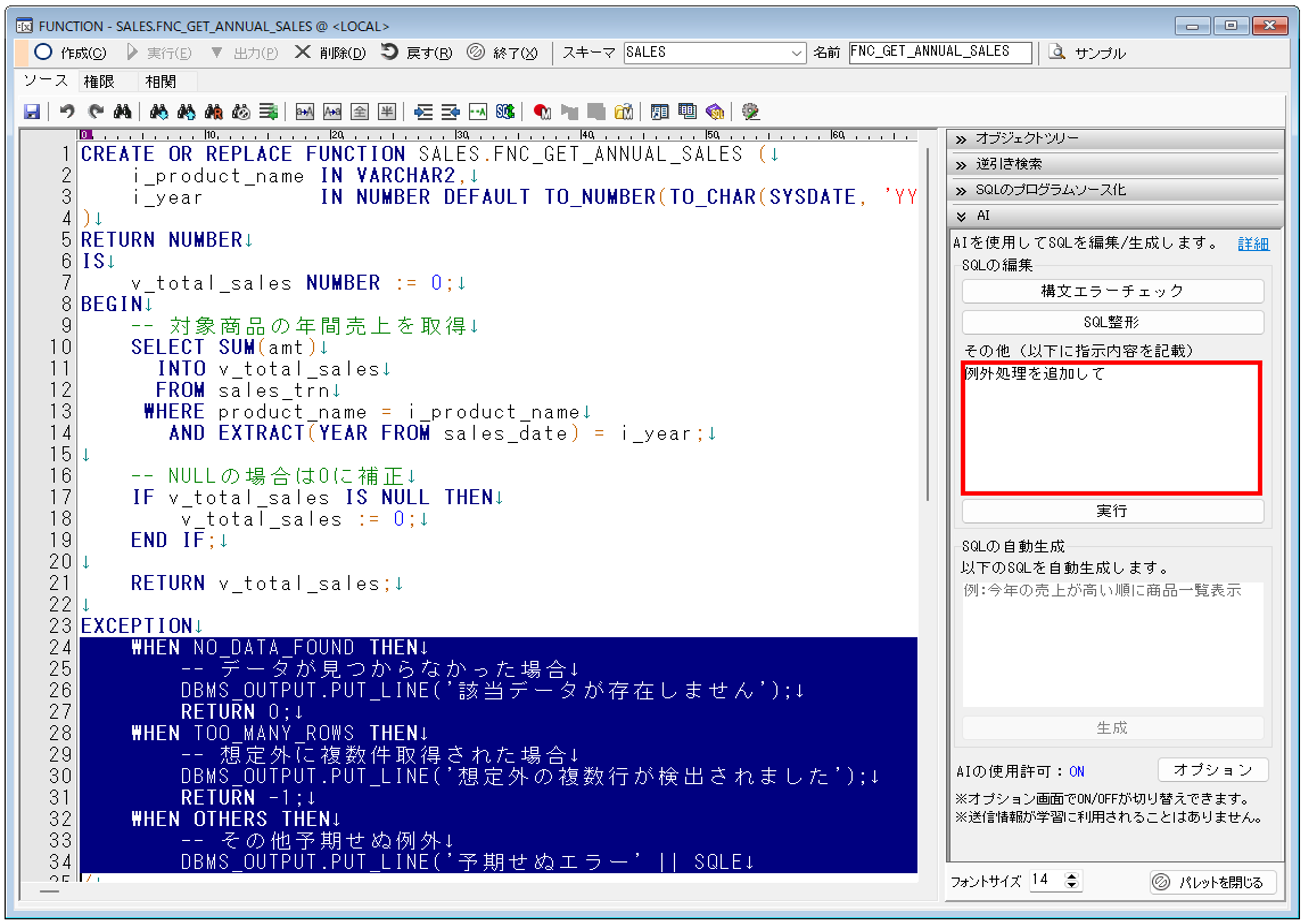 日本語のプロンプト(指示文)を入力し、SQLを加工できる機能です。「データ型の長さを倍にする」「例外処理を追加する」等、従来は手間のかかったSQLの修正作業を省力化することができます。
