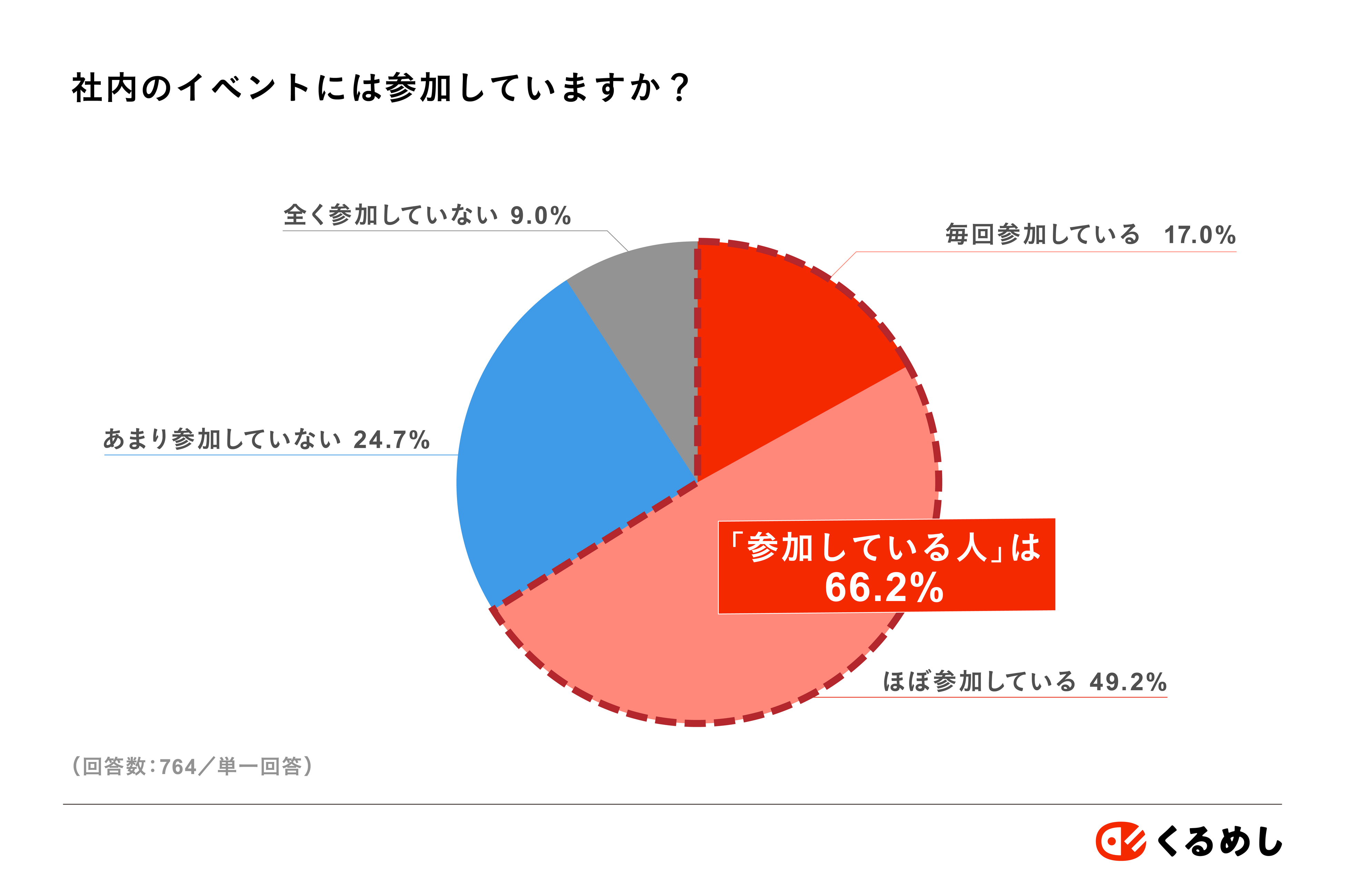 社員同士のコミュニケーションを活性化させるイベントを定期的に実施している企業は71.6%でした。そのイベントに毎回参加している人は17.0%、ほぼ参加している人は49.2%と、全体で66.2%の人が積極的に社内イベントに参加していることがわかりました。